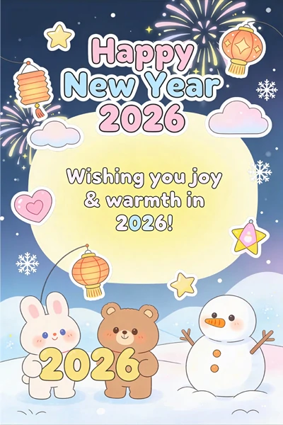 Happy new year template free, cute cartoon animals and chibi characters holding '2026', soft pastel color palette with warm tones, round bubbly typography, kawaii style lanterns and stars, cozy winter scene with cute snowman and sparkly fireworks, sticker-style decorative elements, friendly hand-lettered headline, bright but readable text area with space for family greeting, kid-friendly cheerful design, A4 poster
