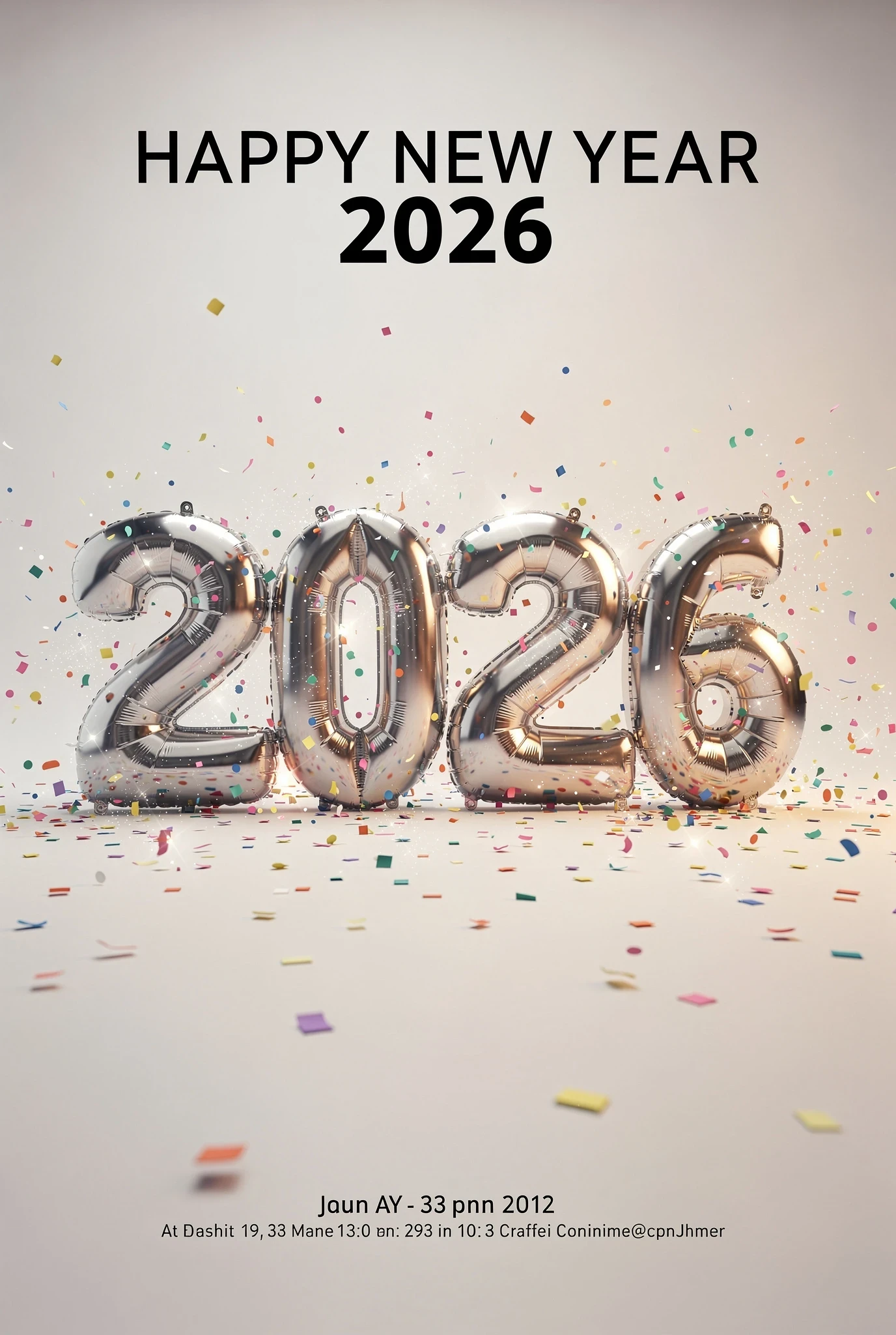Happy New Year Poster 2026, 3D balloon numbers '2026' with glossy reflections and realistic shadows, inflated chrome typography effect, studio lighting with soft highlights, colorful confetti and sparkles, minimal background, bold modern sans serif headline, high-energy festive vibe, A3 poster