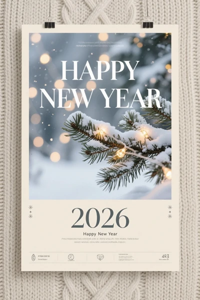 Happy New Year Poster 2026, winter cozy aesthetic with snowy pine branches, soft warm lights, cool blue-gray and warm cream color palette, minimal winter scene, elegant modern typography, knit texture background option, simple icon accents, clean info panel, cozy festive mood, A4 poster