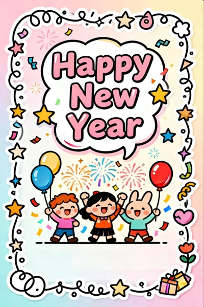 Happy new year template free, sticker pack style icons with stars, fireworks, balloons, and confetti, cute doodle border frame, hand-drawn decorative elements, kawaii characters cheering, bubble typography, soft pastel gradients, bright but readable text area, playful layout, kid-friendly cheerful design, A4 poster