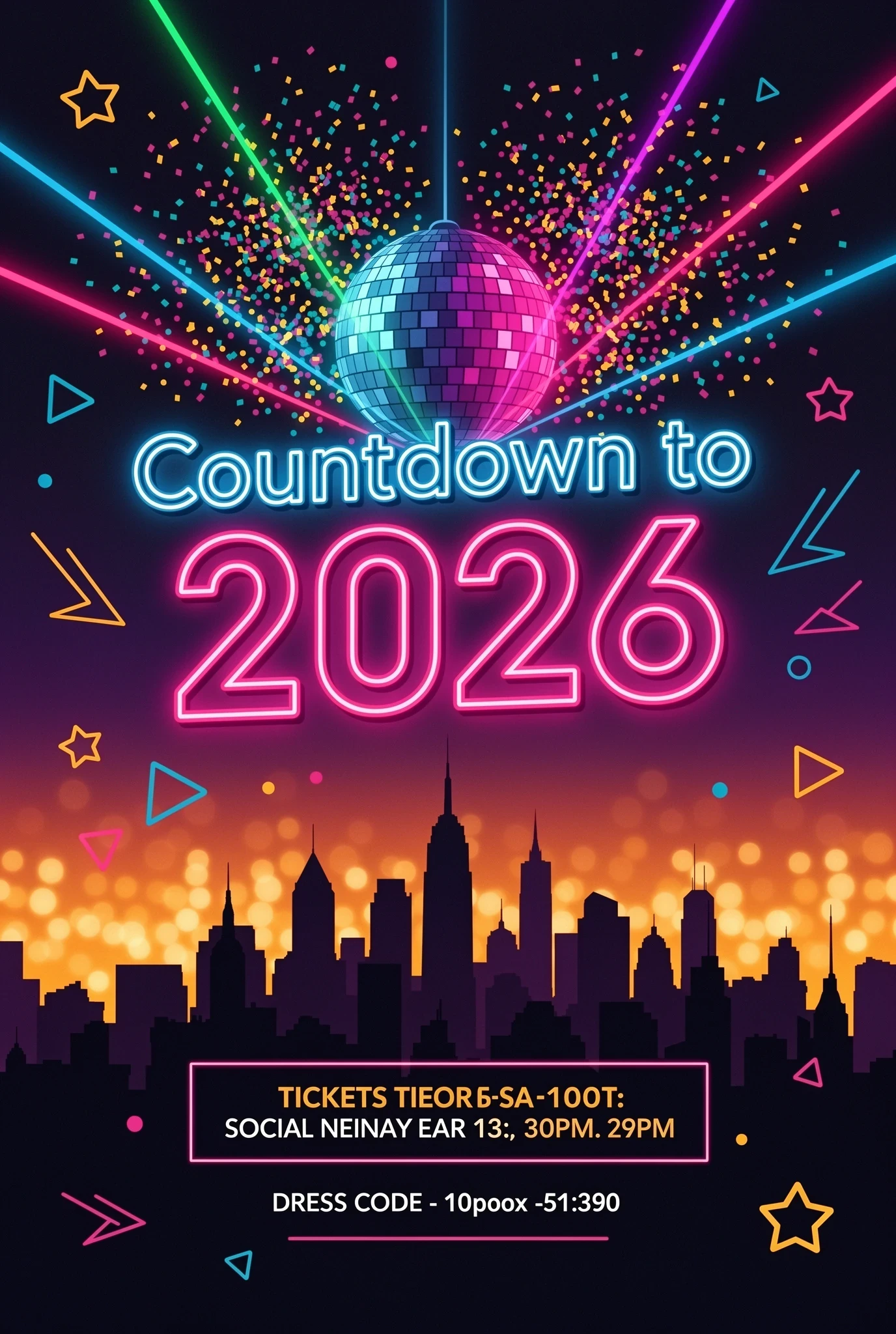 New Year's Eve party flyer, neon glow typography ‘Countdown to '2026’, dark club background with vibrant laser beams and disco ball reflections, colorful confetti burst, city skyline silhouette with warm bokeh lights, high-energy layout with bold countdown numbers, retro gradient background, playful geometric shapes, stylized stars, modern sans serif typography, event details block with ticket info area, dress code line, upbeat festive vibe, social-friendly 1080×1350 vertical format.