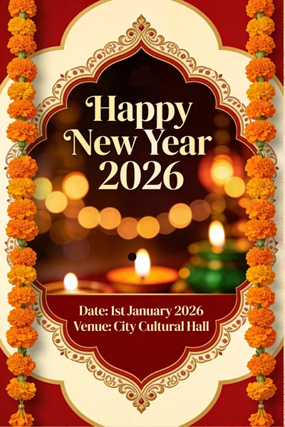 Happy New Year Poster 2026, Indian festival-inspired design with ornamental decorative border, marigold garlands and warm festival lights, rich jewel tone color palette, elegant typography mixing traditional and modern styles, warm bokeh background, space for event details, festive mood, A3 poster