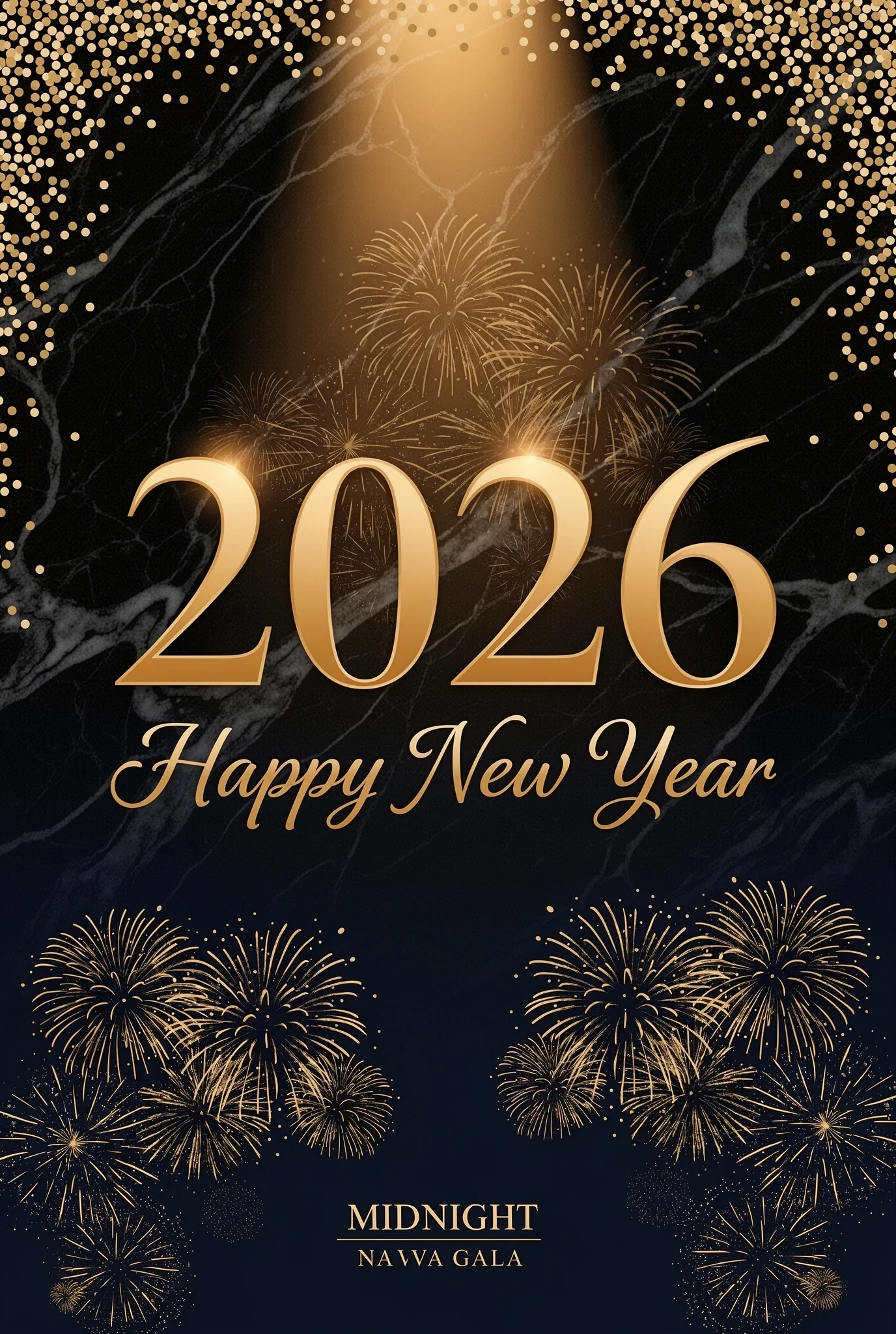 Happy New Year Poster 2026, luxury gold foil embossed numbers '2026', black marble or midnight navy background, elegant serif typography with gold calligraphy headline, subtle champagne gold confetti sparkles, centered composition with generous margins, warm spotlight lighting, glossy metallic highlights, minimal copy area for event details, premium invitation layout, high contrast, print-ready A3 poster design.
