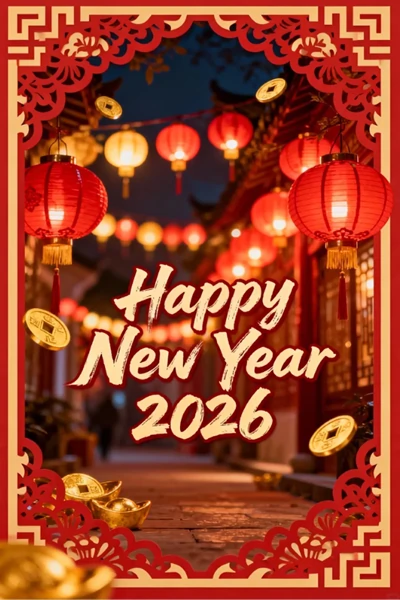 Happy New Year 2026 poster, Chinese lantern festival style with vibrant red and gold palette, intricate paper-cut decorative border frame, elegant calligraphy headline with traditional brush strokes, red lanterns and gold coins, warm festival lights, ornamental border design, clean copy area with space for event details, festive mood, A4 poster