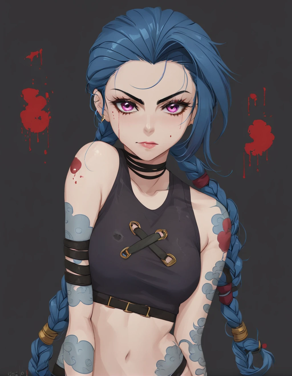 jinx,low twintails,blue hair,pink eyes,masterpiece