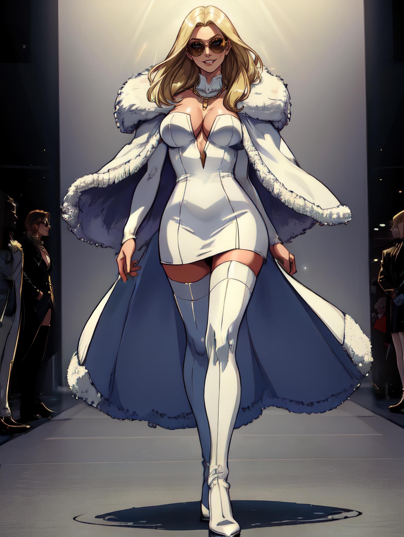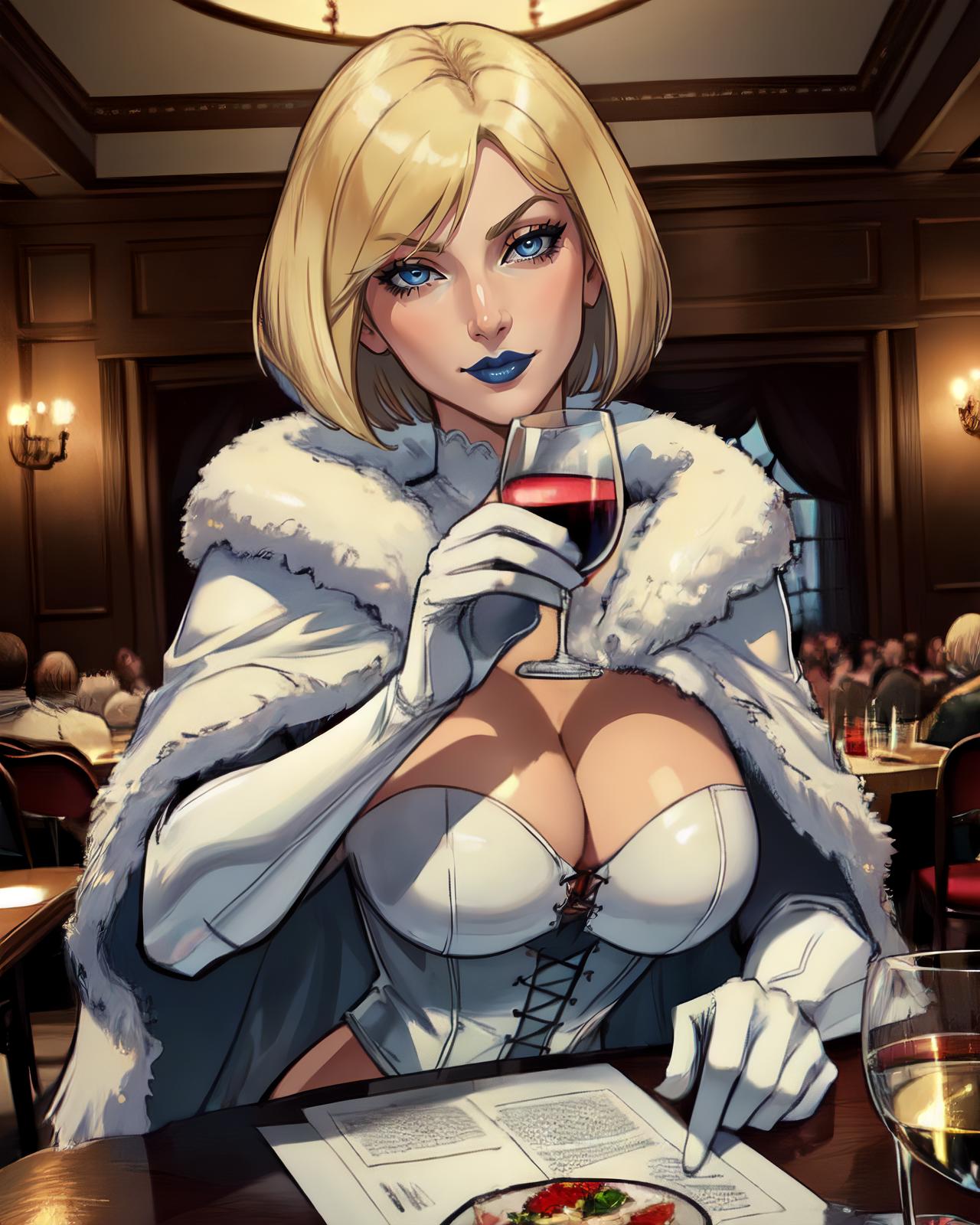 Best used at 0.6 - 1 strength. Activation tag is "Emma Frost" followed by either "corset" or midriff" and any following combination of "gloves, cape, thigh highs, pants, shirt dress, fur trim" etc that you want. She is a fashionable mutant so her outfit is pretty customizable.