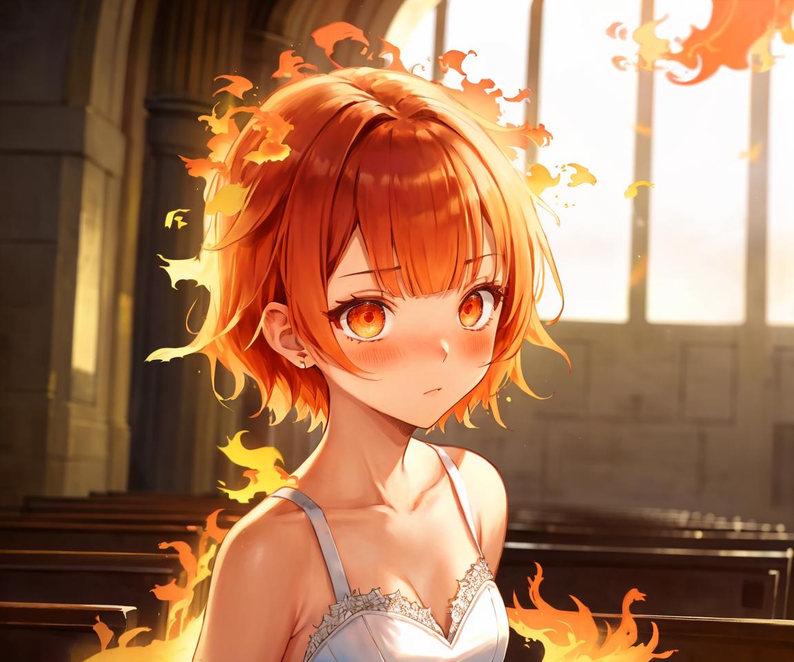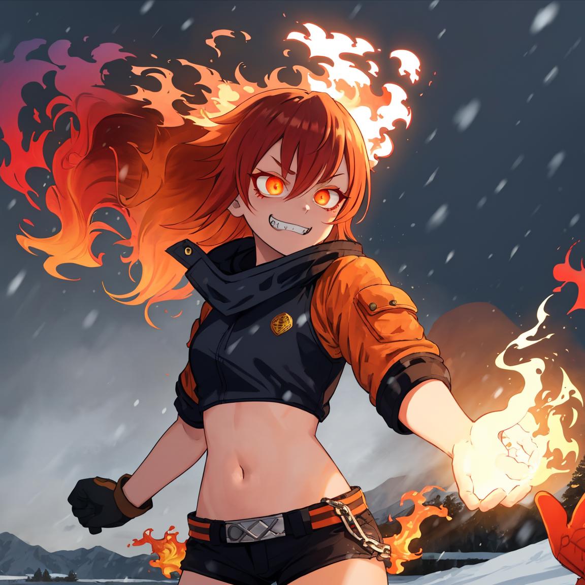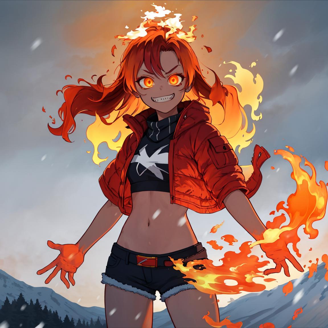 probably recommended tags: fiery_hair <-- I would suggest messing around with adding it and taking it away, it tends to add too much fire, but when it isn't added the fire effect sometimes disappears, though sometimes it still looks good without it
