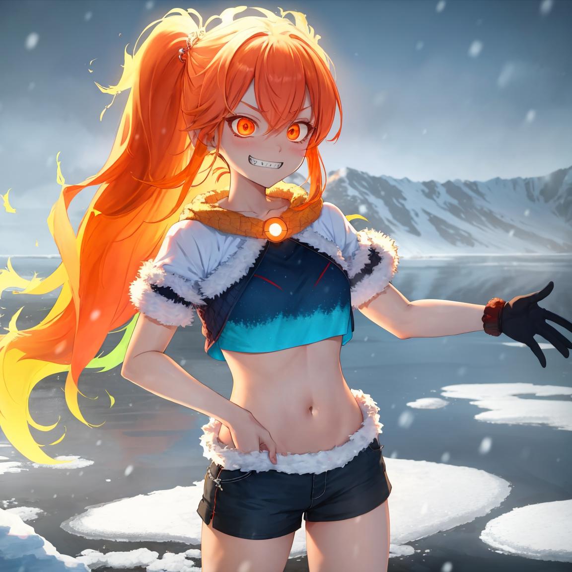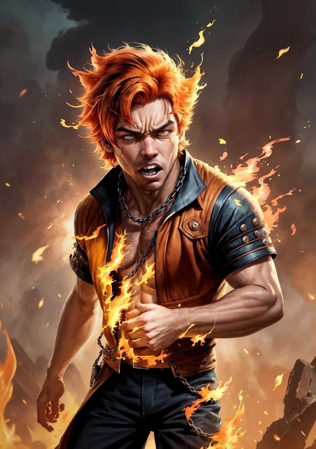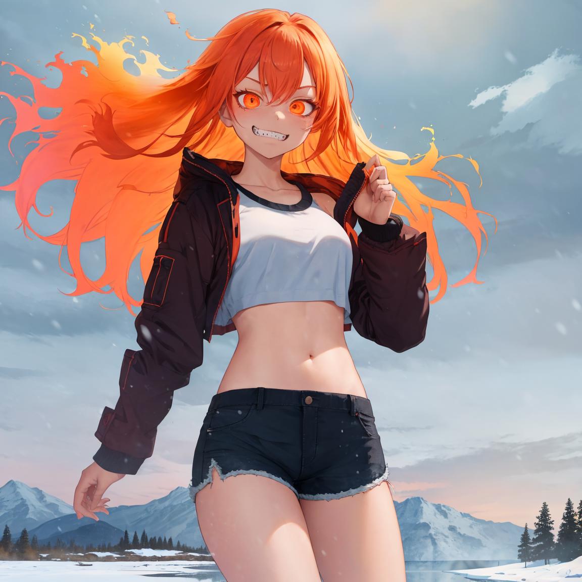 probably recommended tags: fiery_hair <-- I would suggest messing around with adding it and taking it away, it tends to add too much fire, but when it isn't added the fire effect sometimes disappears, though sometimes it still looks good without it