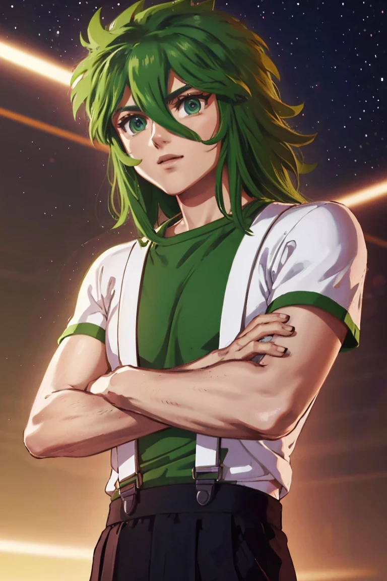 shun, green hair, shirt, green eyes, suspenders, green shirt, androgynous, short sleeves, 1boy, male focus, hair between eyes, bangs