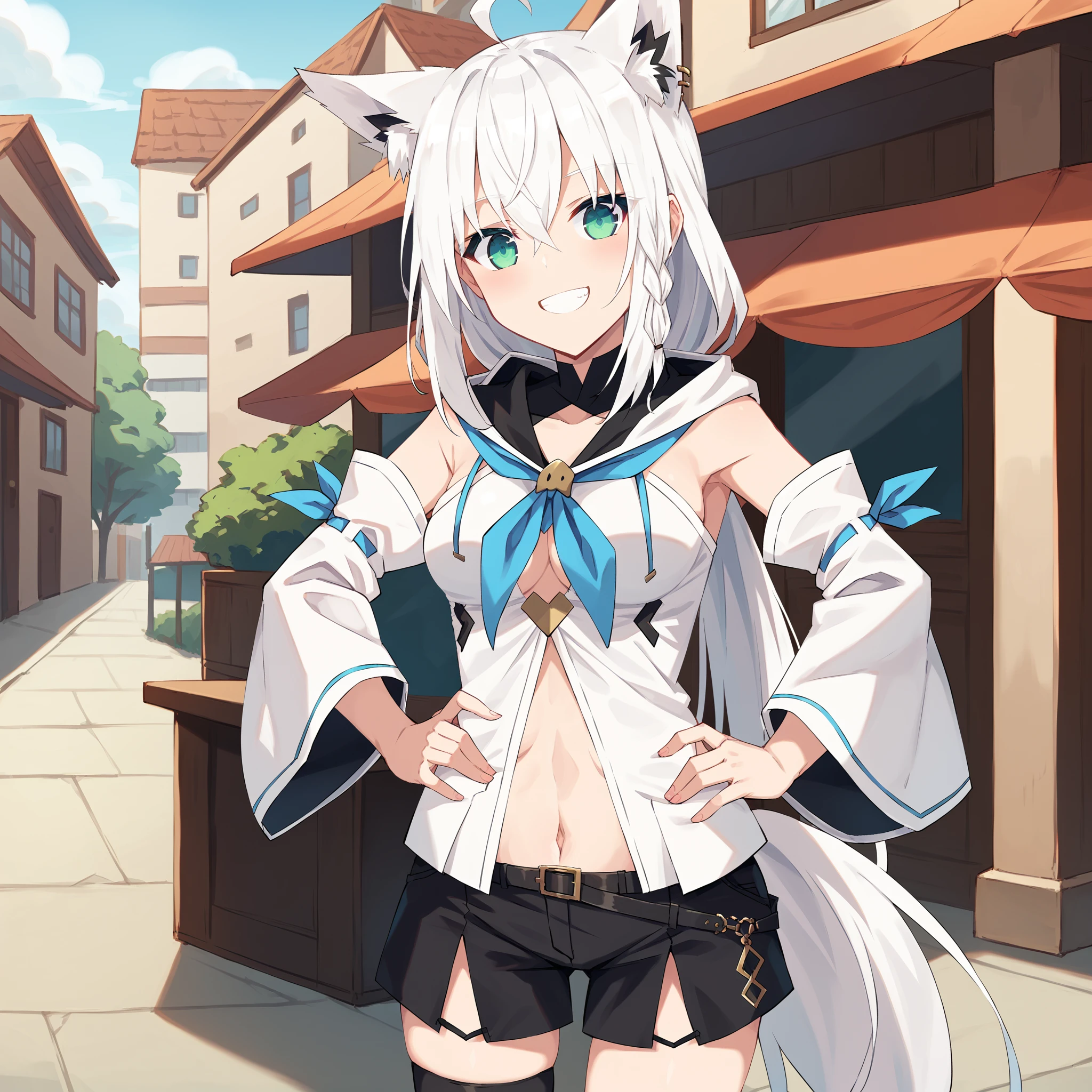 Shirakami_Fubuki, white hair, long hair, ahoge, animal ears, green eyes, breasts, fox tail