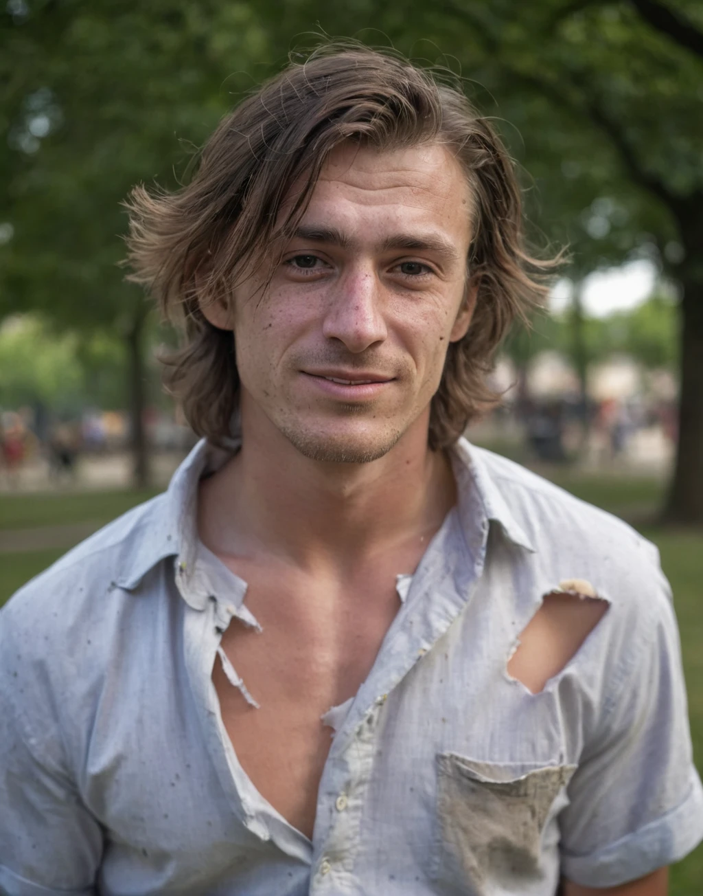 Example: Jeans torn at ???? and thighs, with fly open and unzipped, tanktop torn at cleavage and shoulders