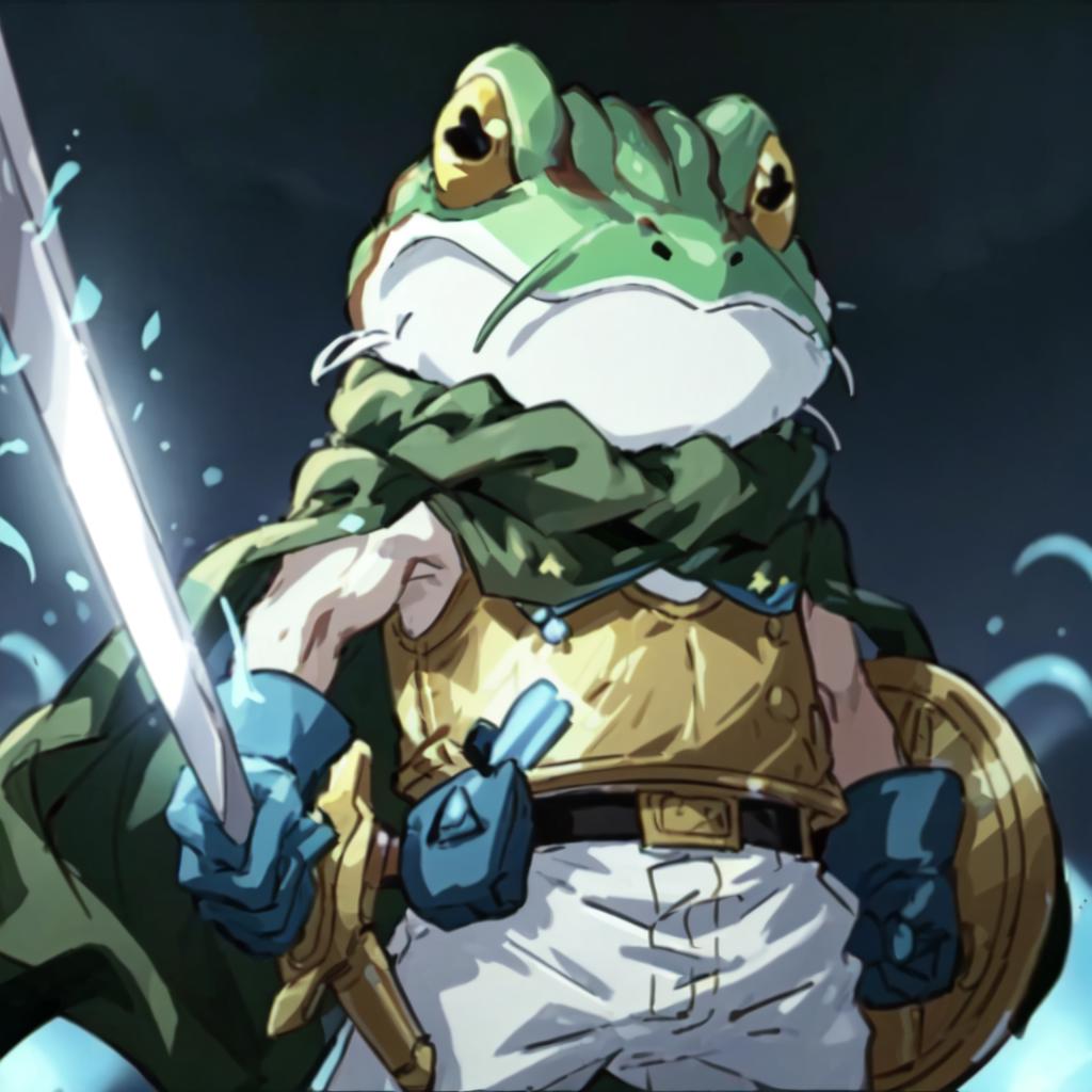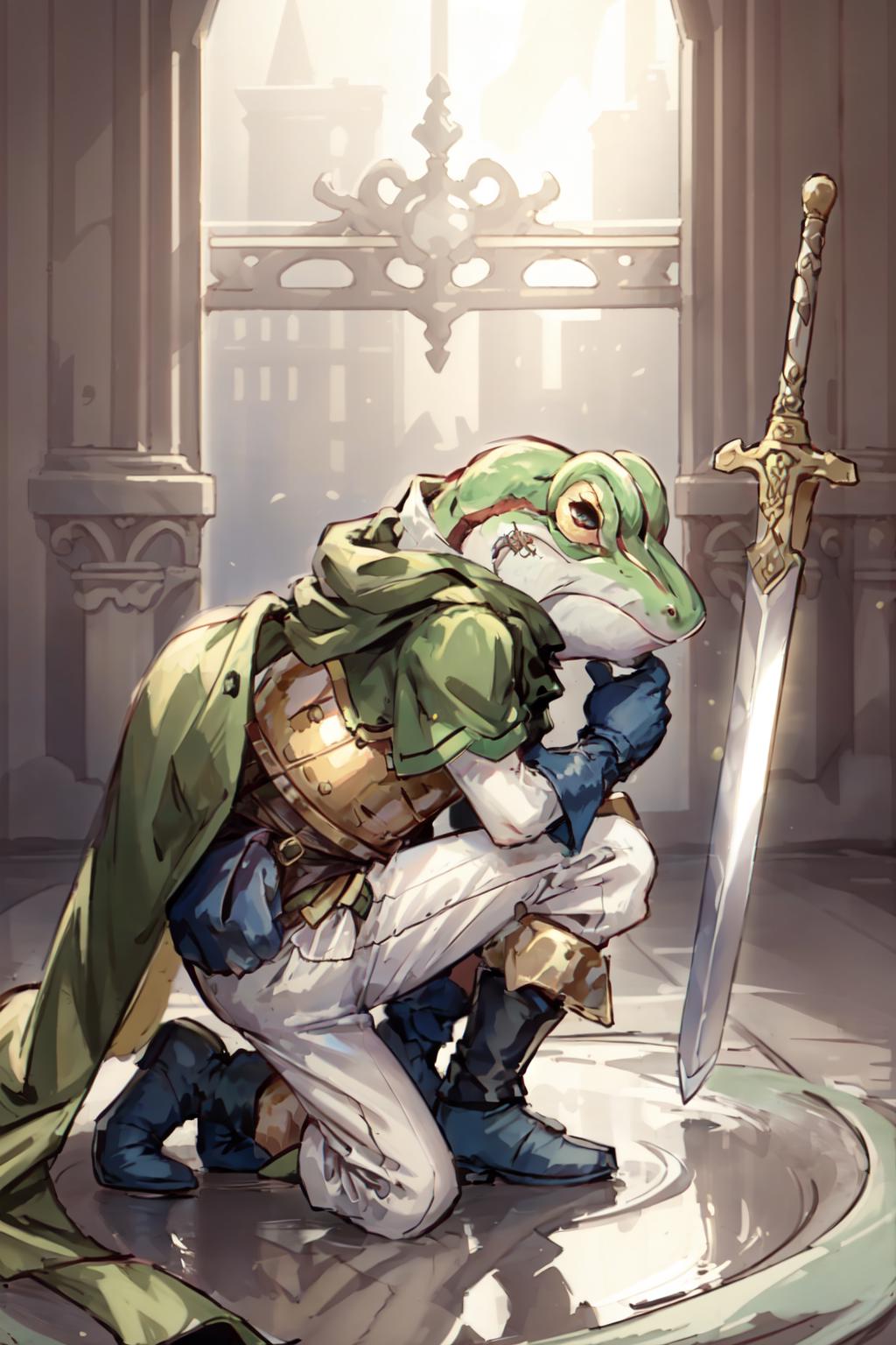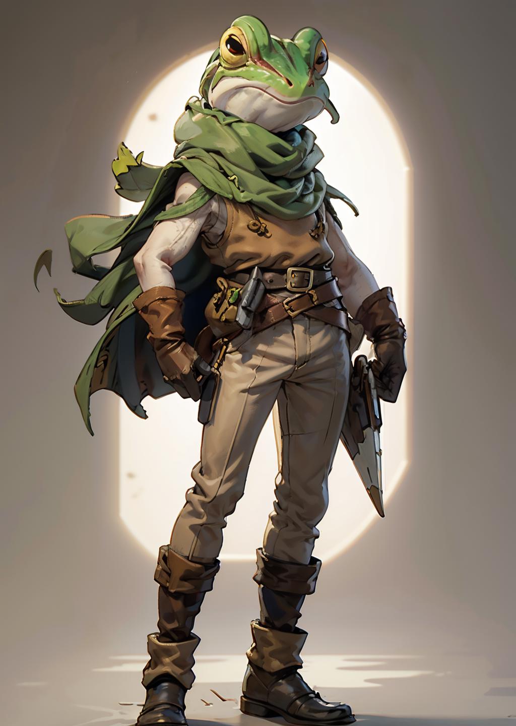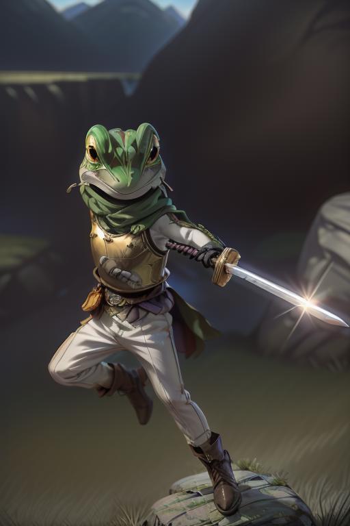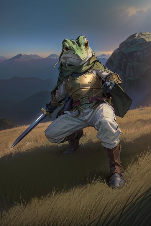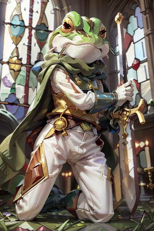 frog, gold breastplate, holding sword and shield, glove, white pants, green cape