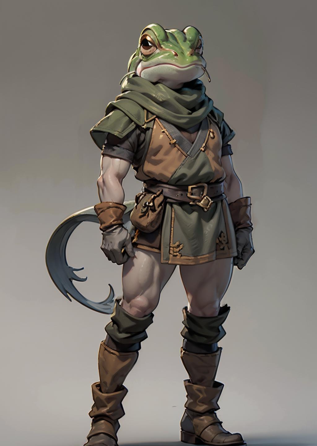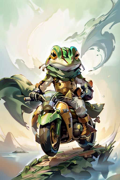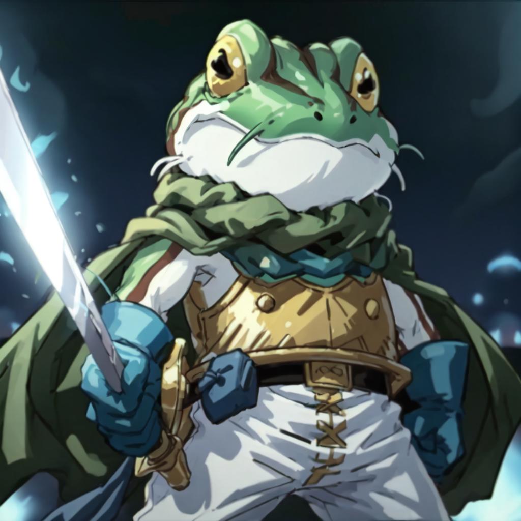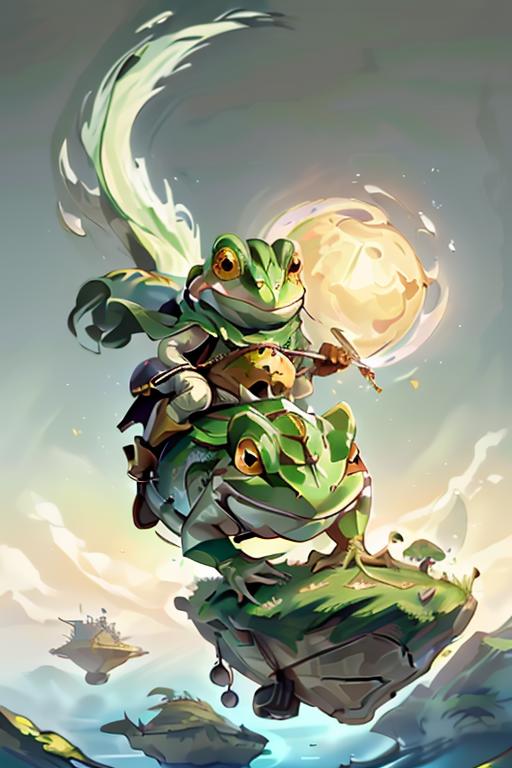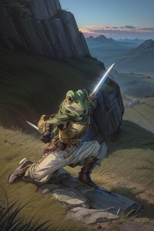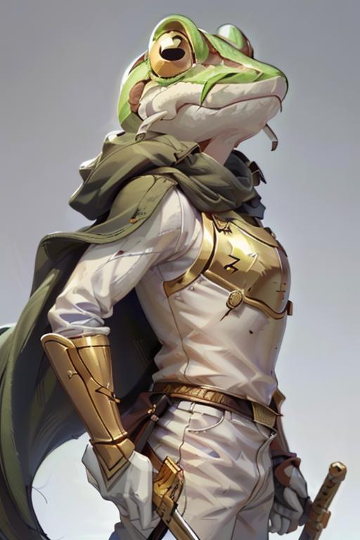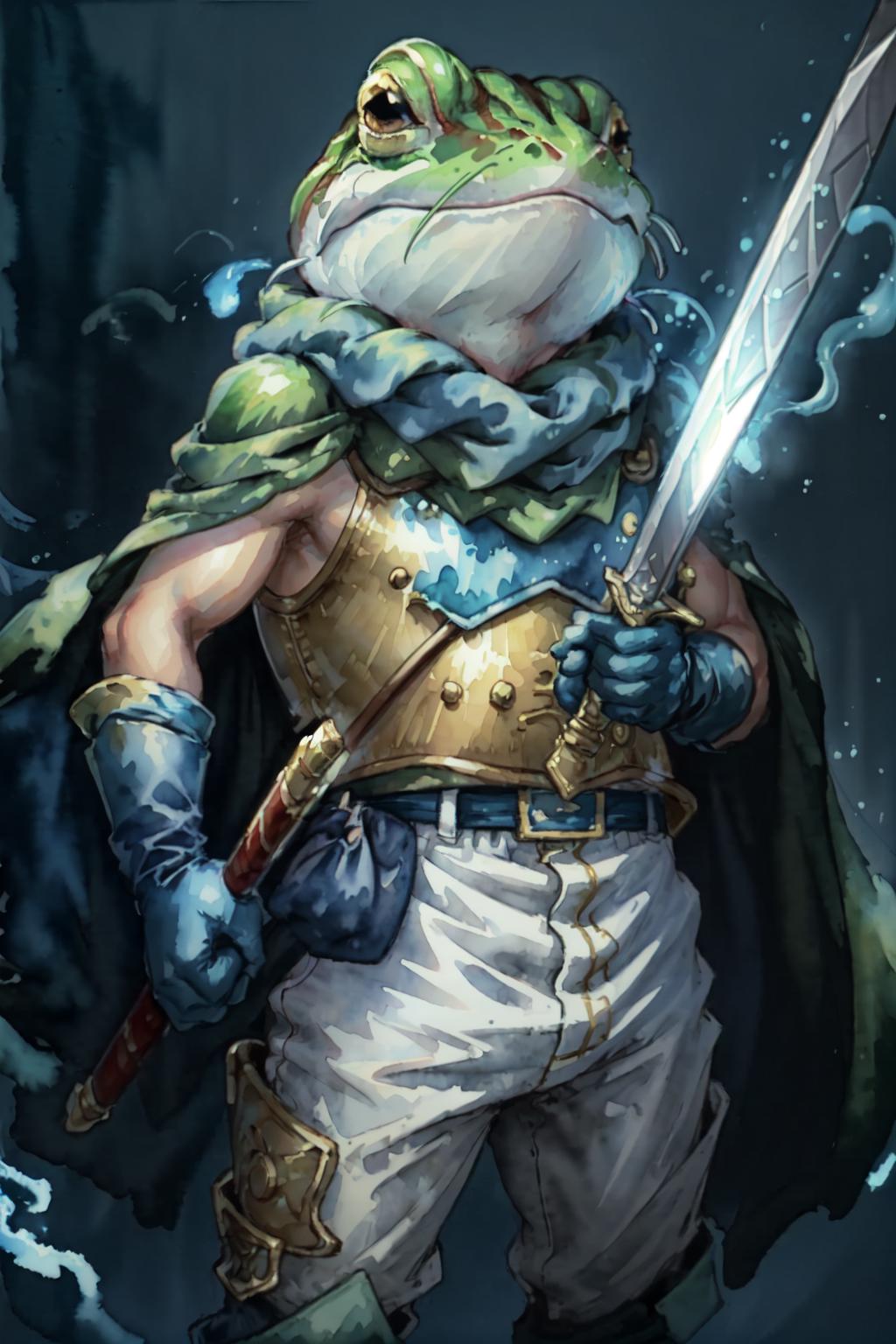 frog, gold breastplate, holding sword and shield, glove, white pants, green cape