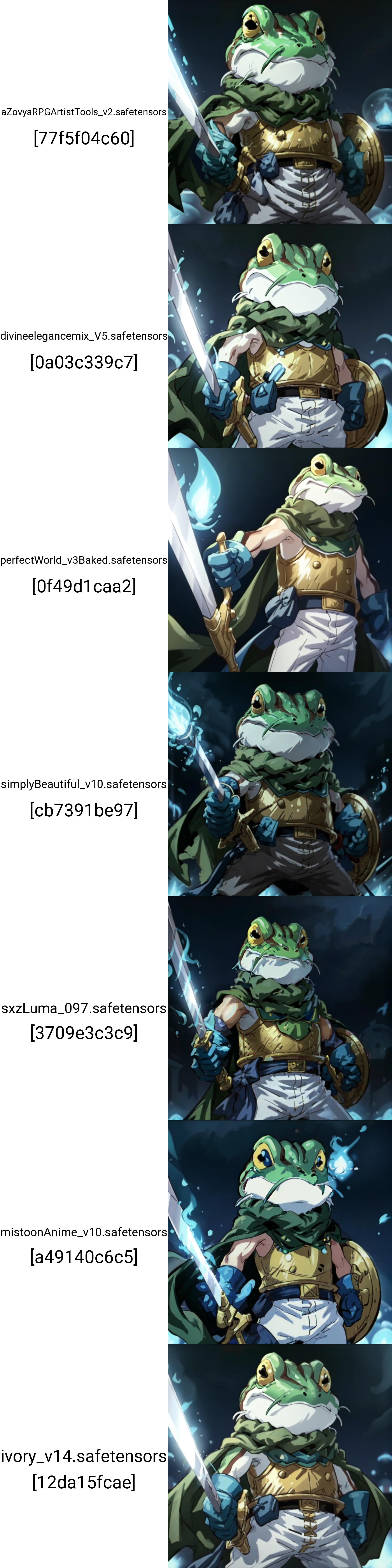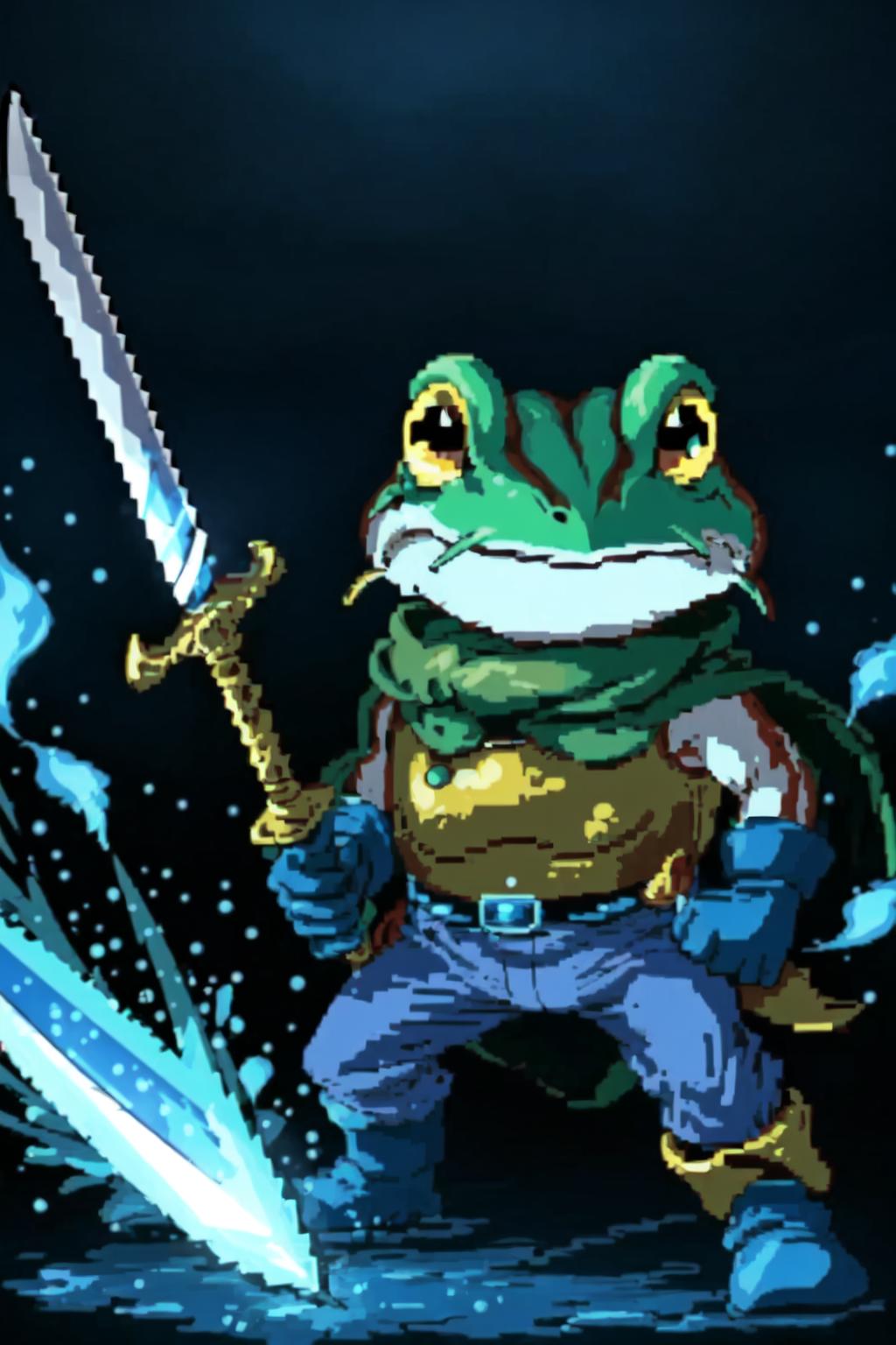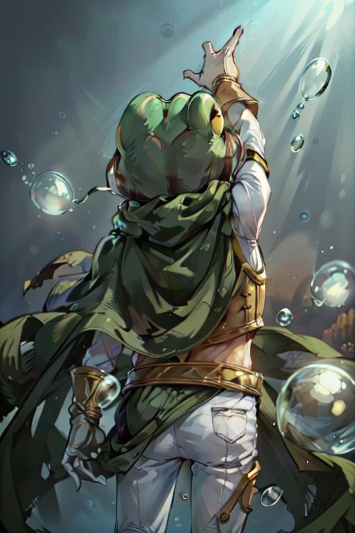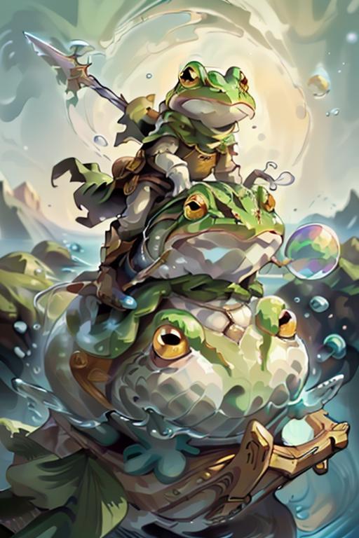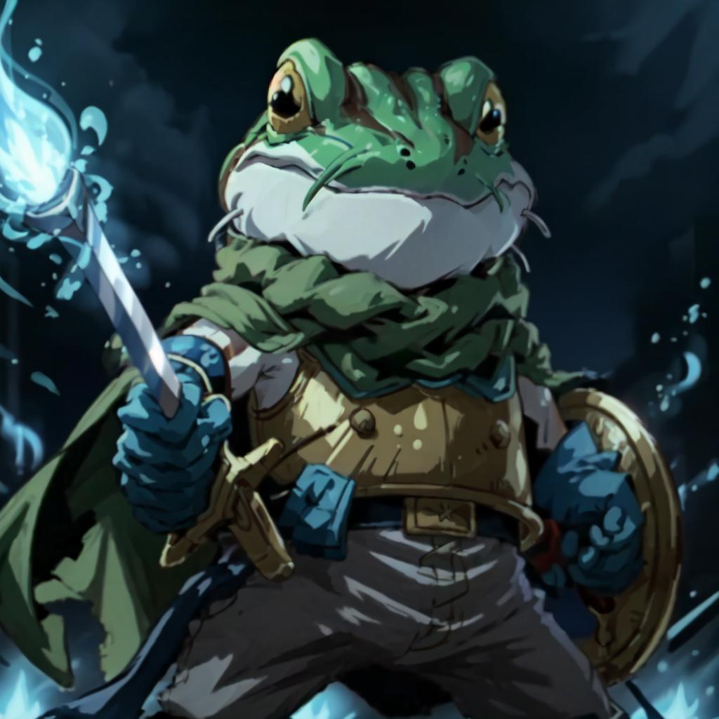 frog, gold breastplate, holding sword and shield, glove, white pants, green cape