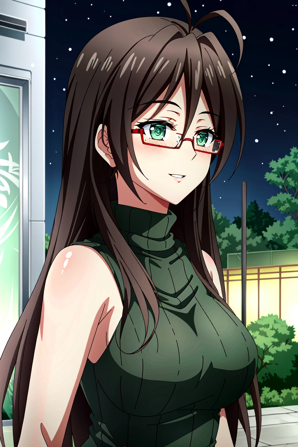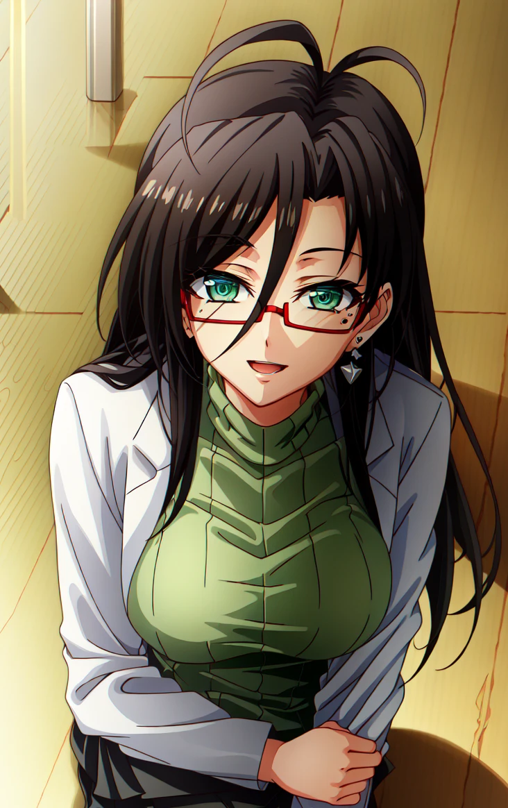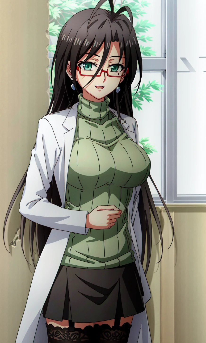 Chisato Hasegawa, 1girl, solo, thighhighs, glasses, long hair, skirt, ???????, labcoat, green eyes, garter straps, ?????????????, turtleneck, sweater, ribbed sweater, black hair, high heels, antenna hair, black background, sitting, brown hair, ???? shoulders, sleeveless turtleneck, smile, miniskirt, sleeveless