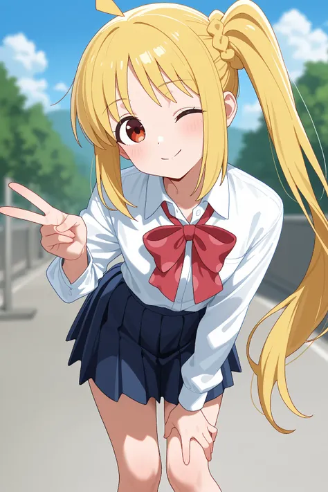 15 years old、One girl、Blonde、Pigtails、Pompadour、Tree Eyes、blazer、tie、skirt