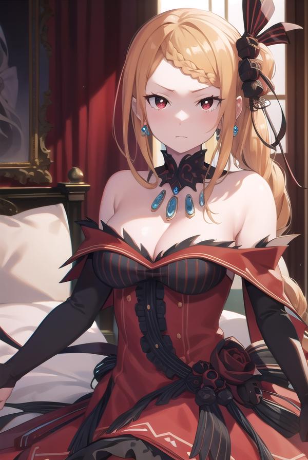 priscilla barielle, long hair, blonde hair, (red eyes:1.5), braid, single braid, braided bangs, one side up,