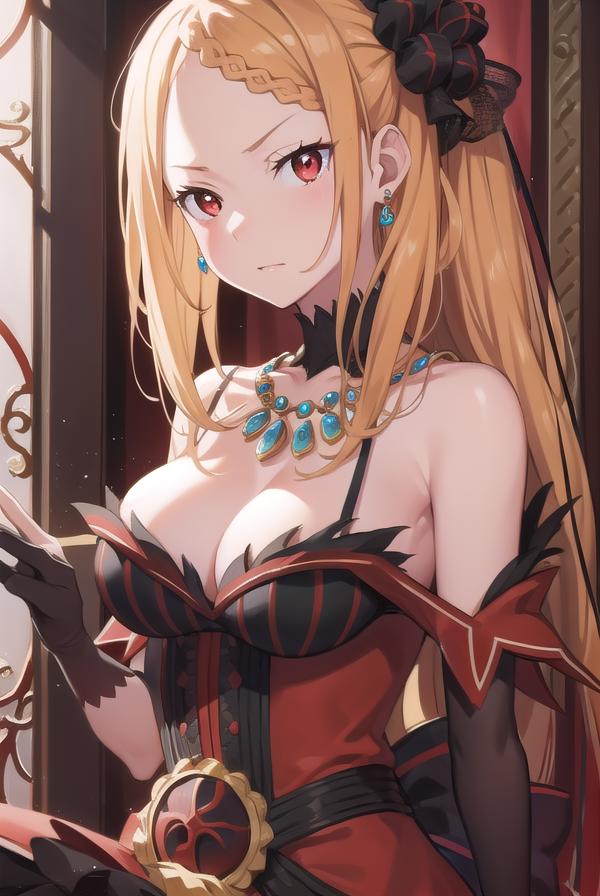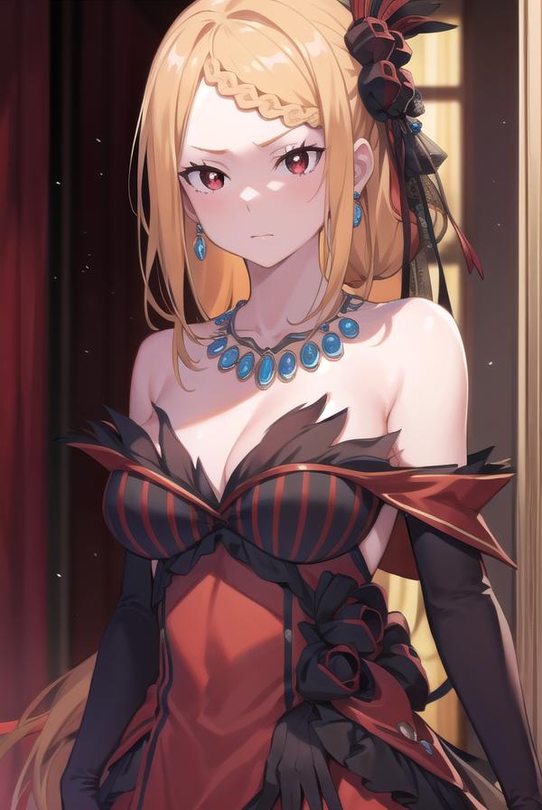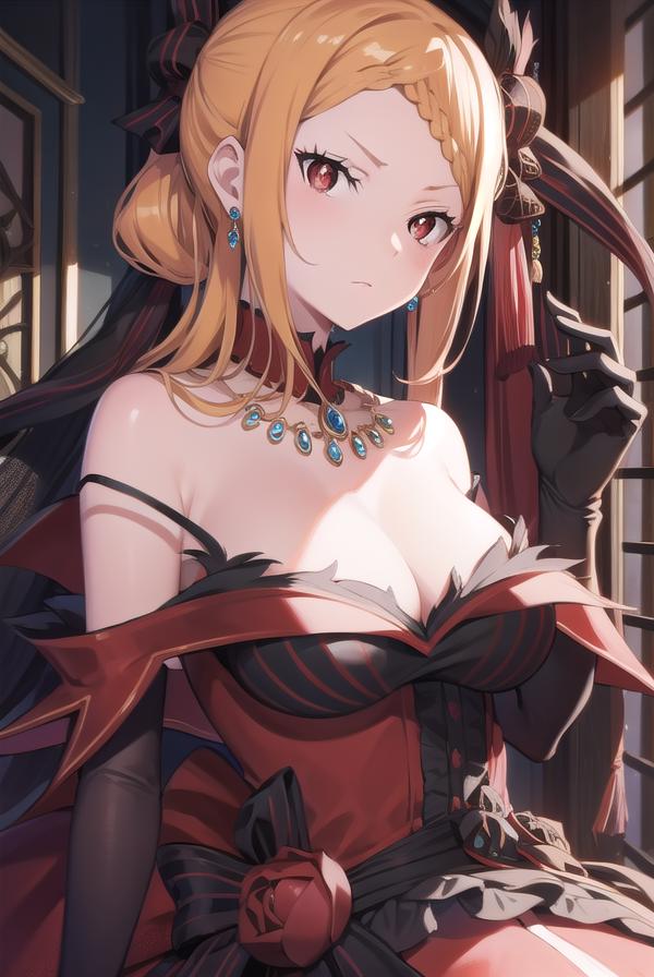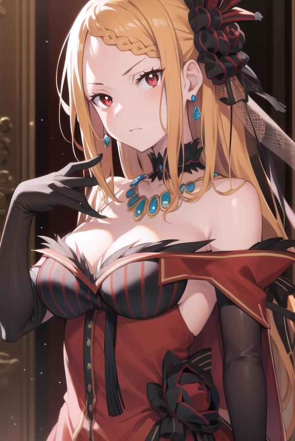 hair ornament, gloves, dress, ???? shoulders, jewelry, pantyhose, earrings, black gloves, necklace, high heels, red dress, red footwear, bridal gauntlets,
