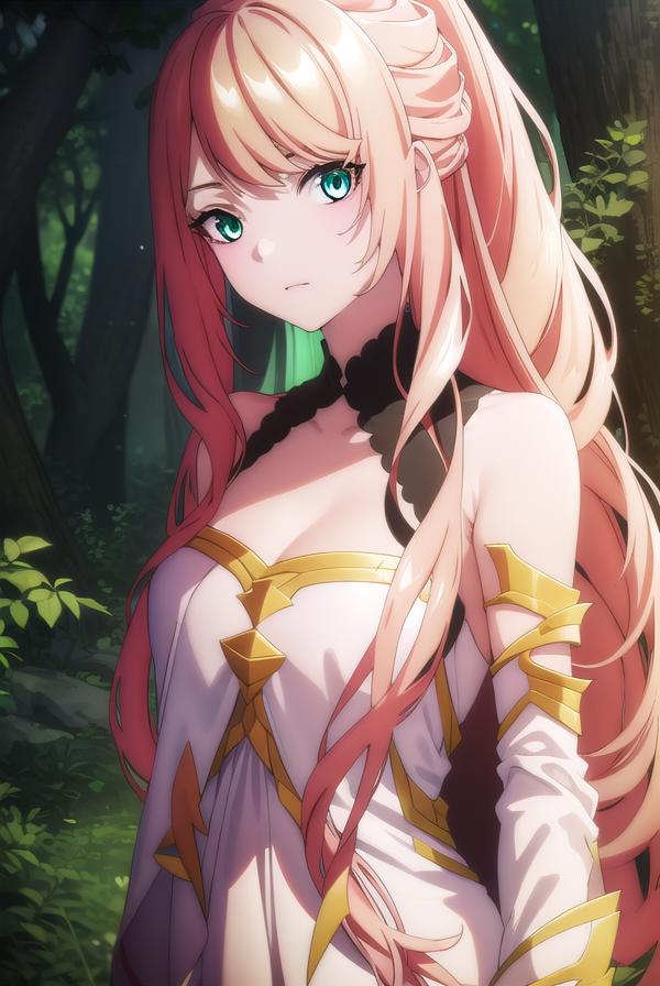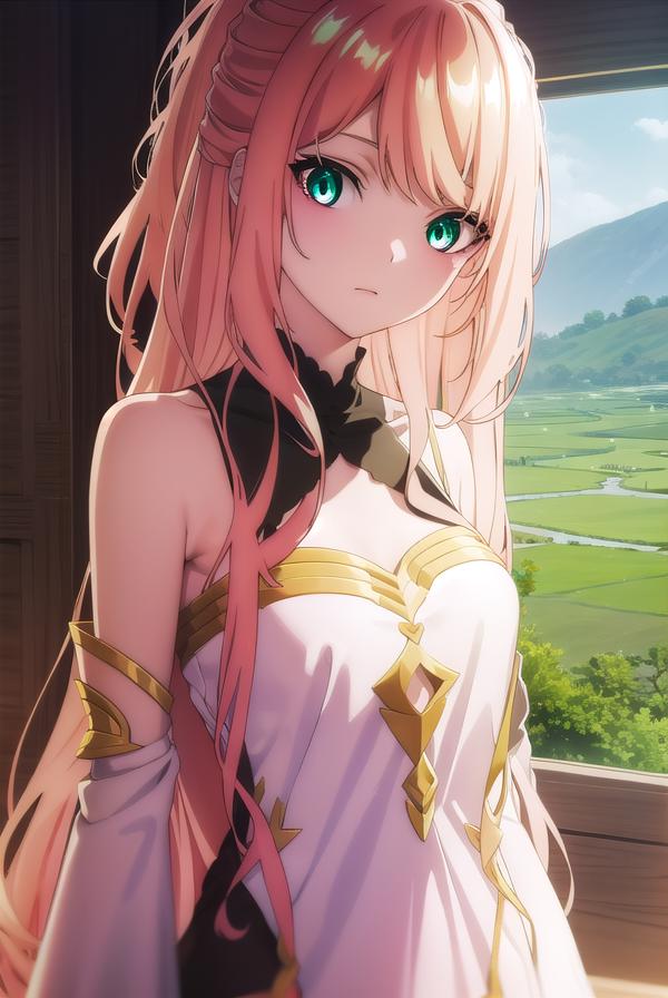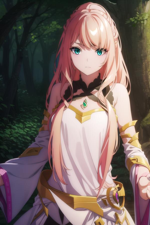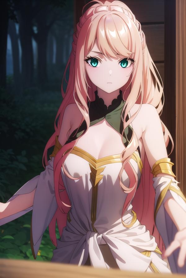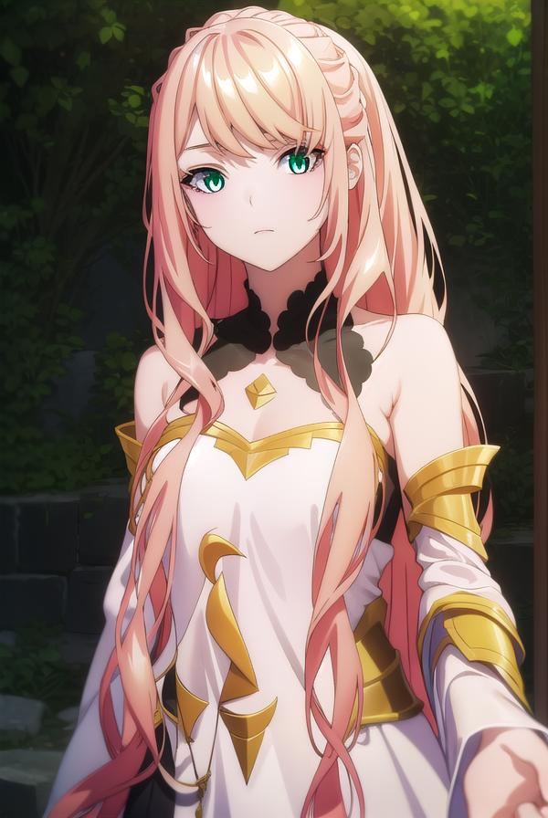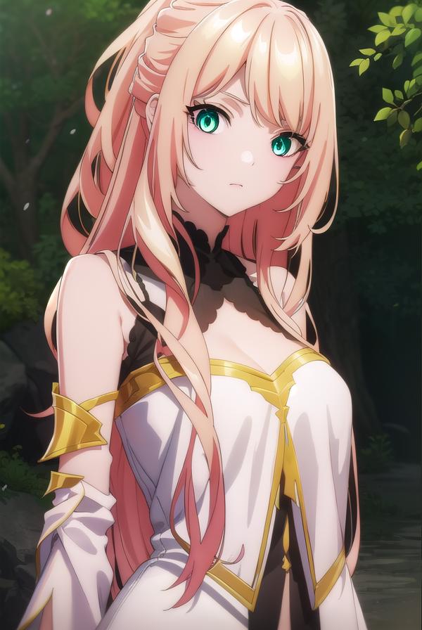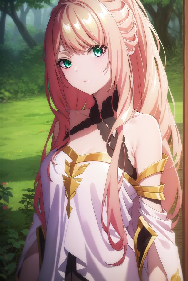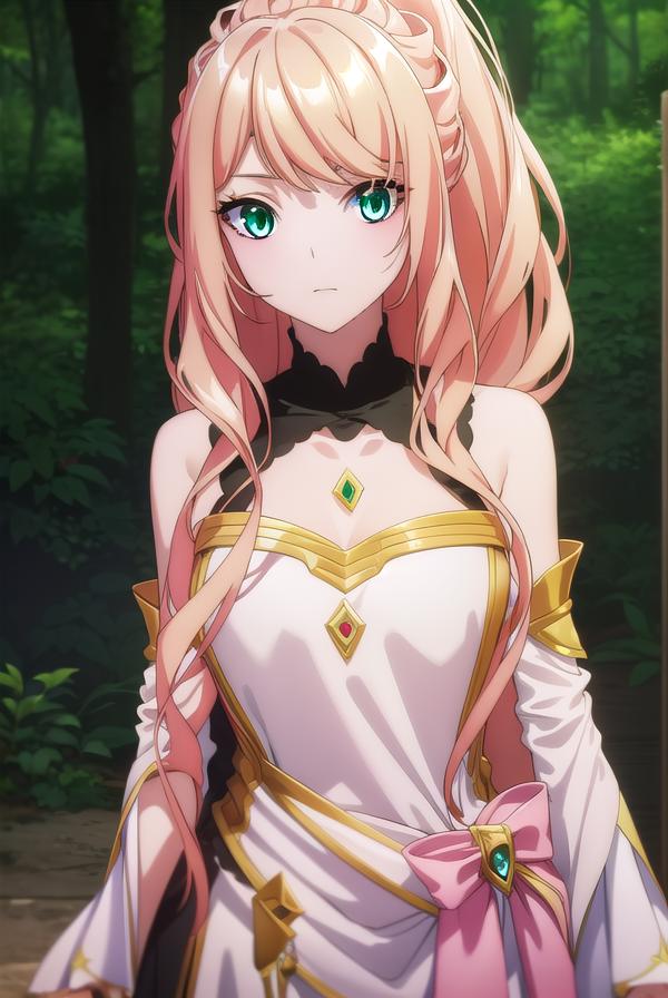 lexia von arselia, long hair, blonde hair, (green eyes:1.5), ponytail, pink hair,