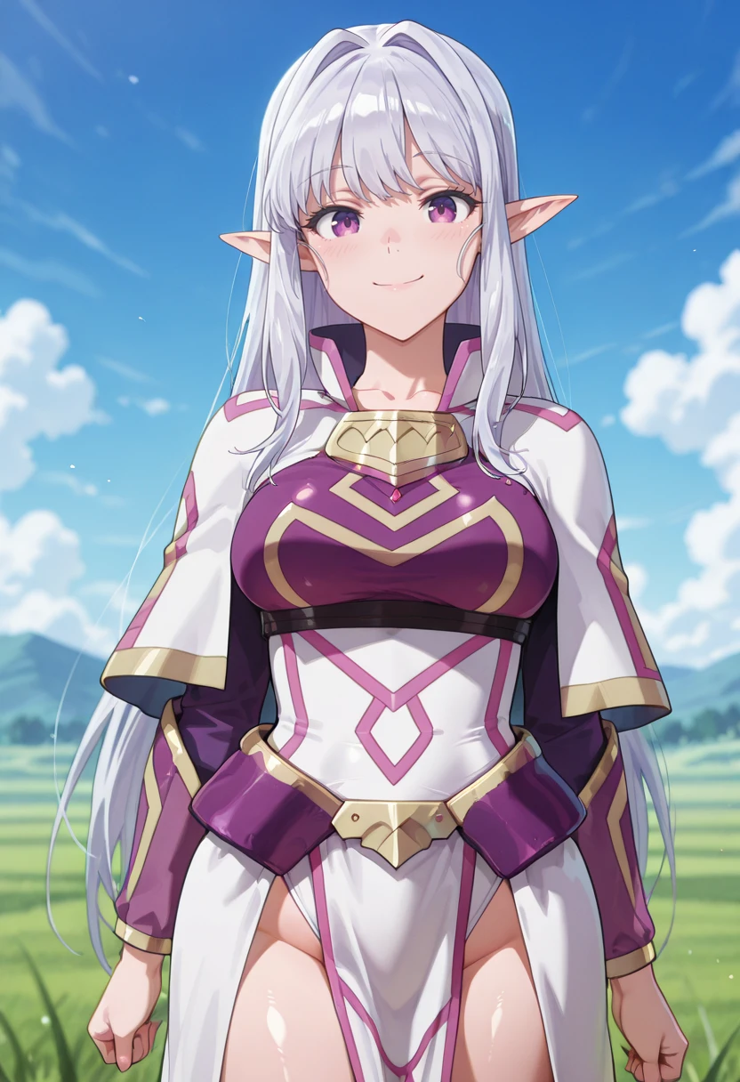 mariabelle, 1girl, solo, long hair, pointy ears, purple eyes, elf, grey hair, medium breasts, pelvic curtain, capelet, dress, hair intakes, very long hair, long sleeves, collarbone, white capelet, (white leotard under clothes), (purple belt:1), ((purple top:1.2))