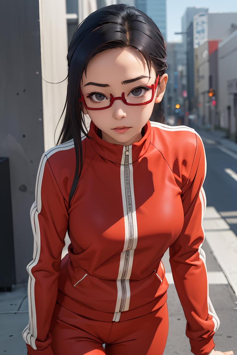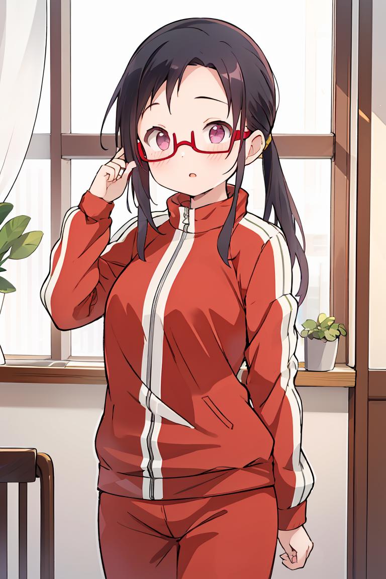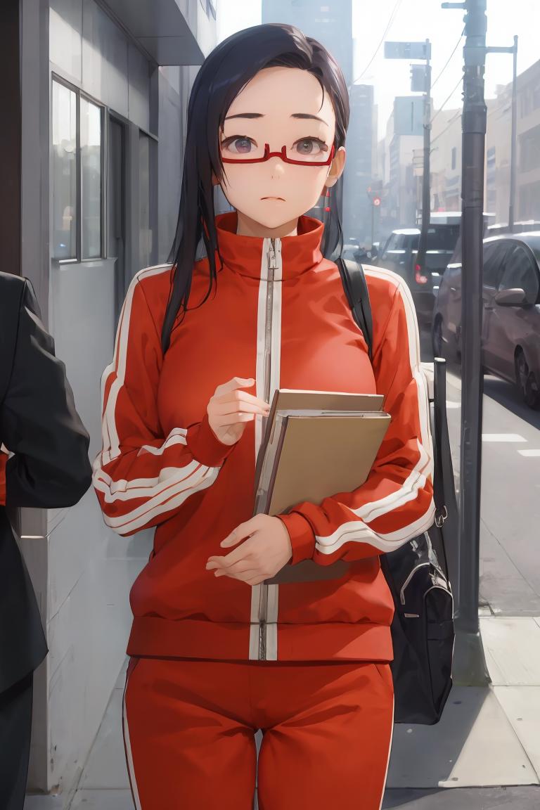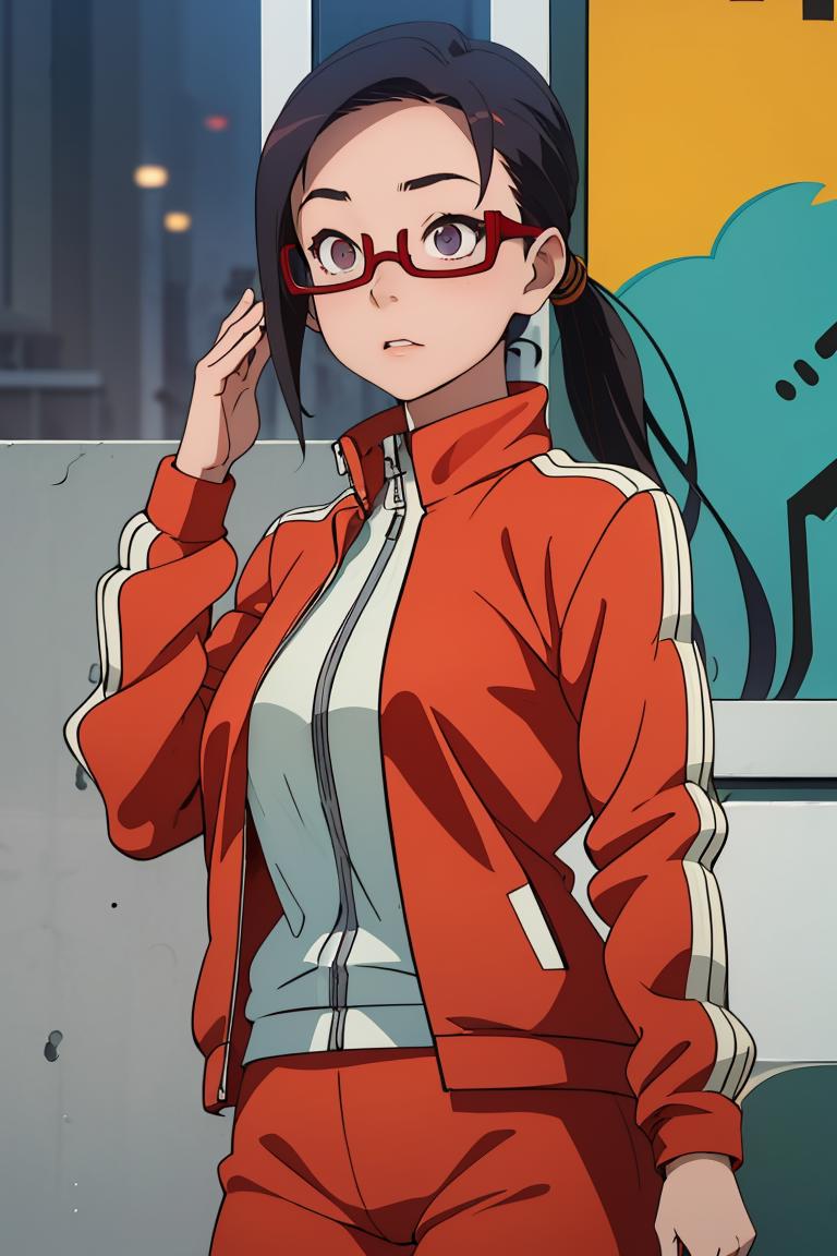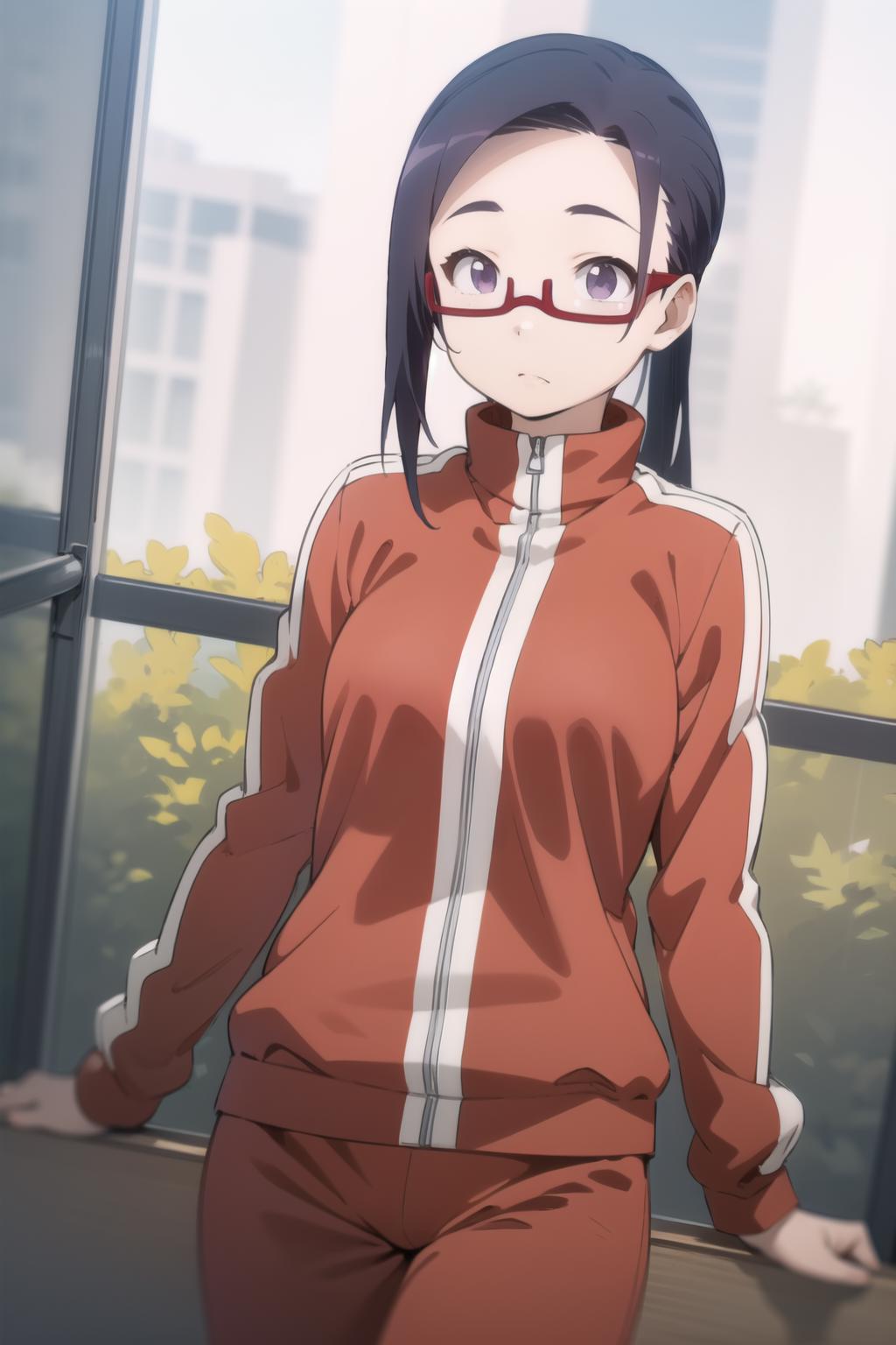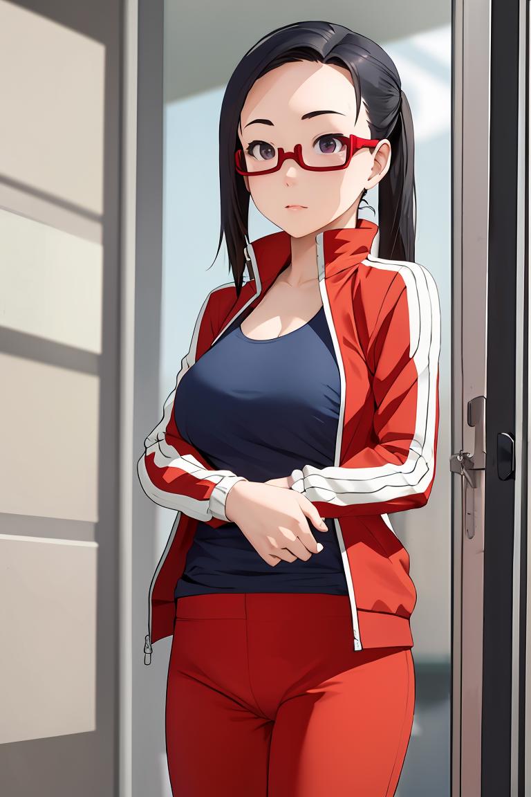 sato, glasses, red-framed eyewear, under-rim eyewear, track jacket, track pants