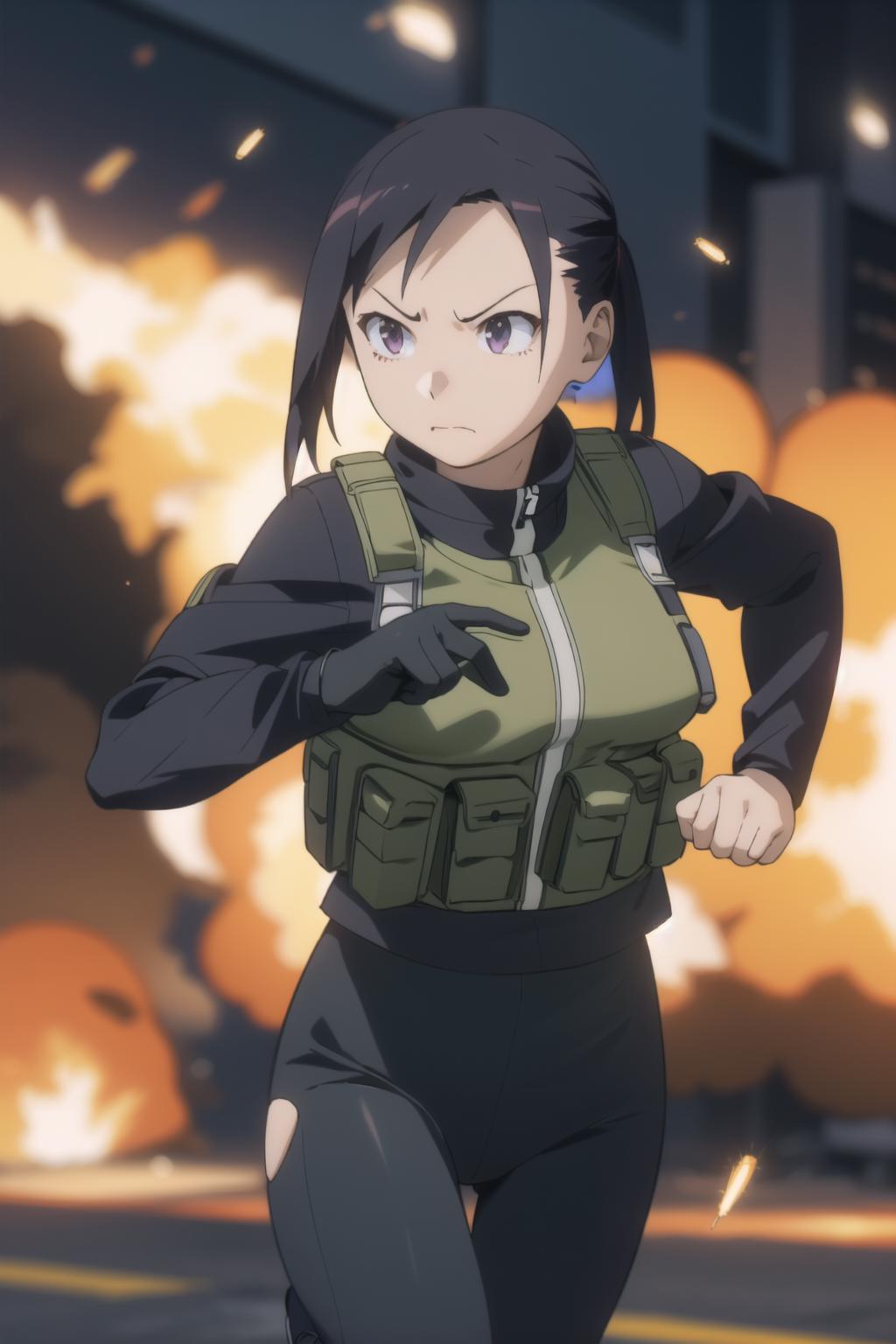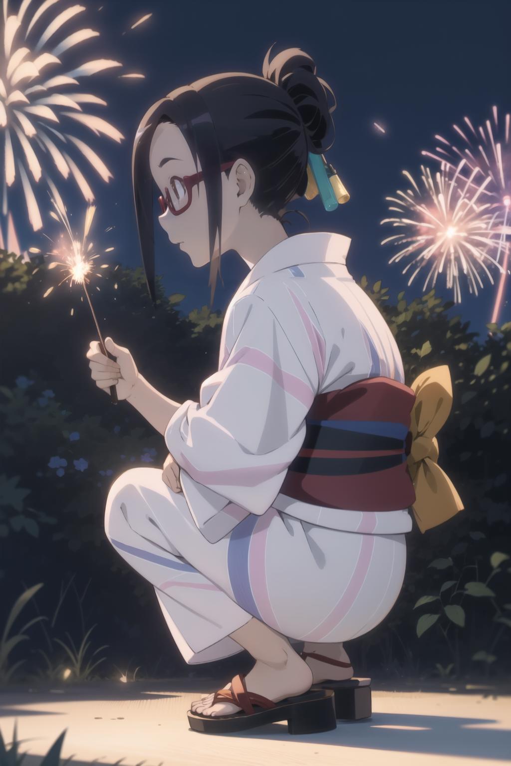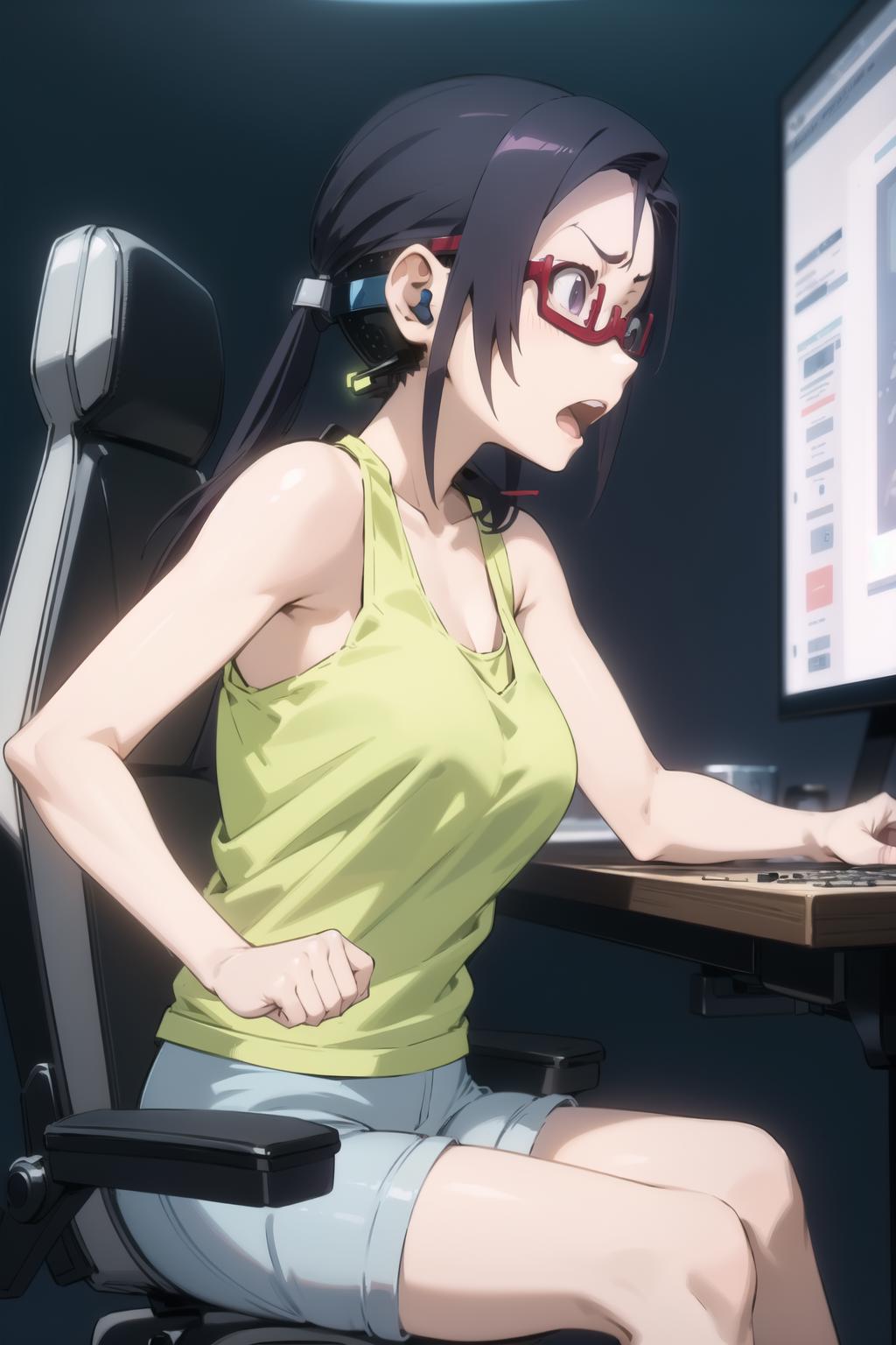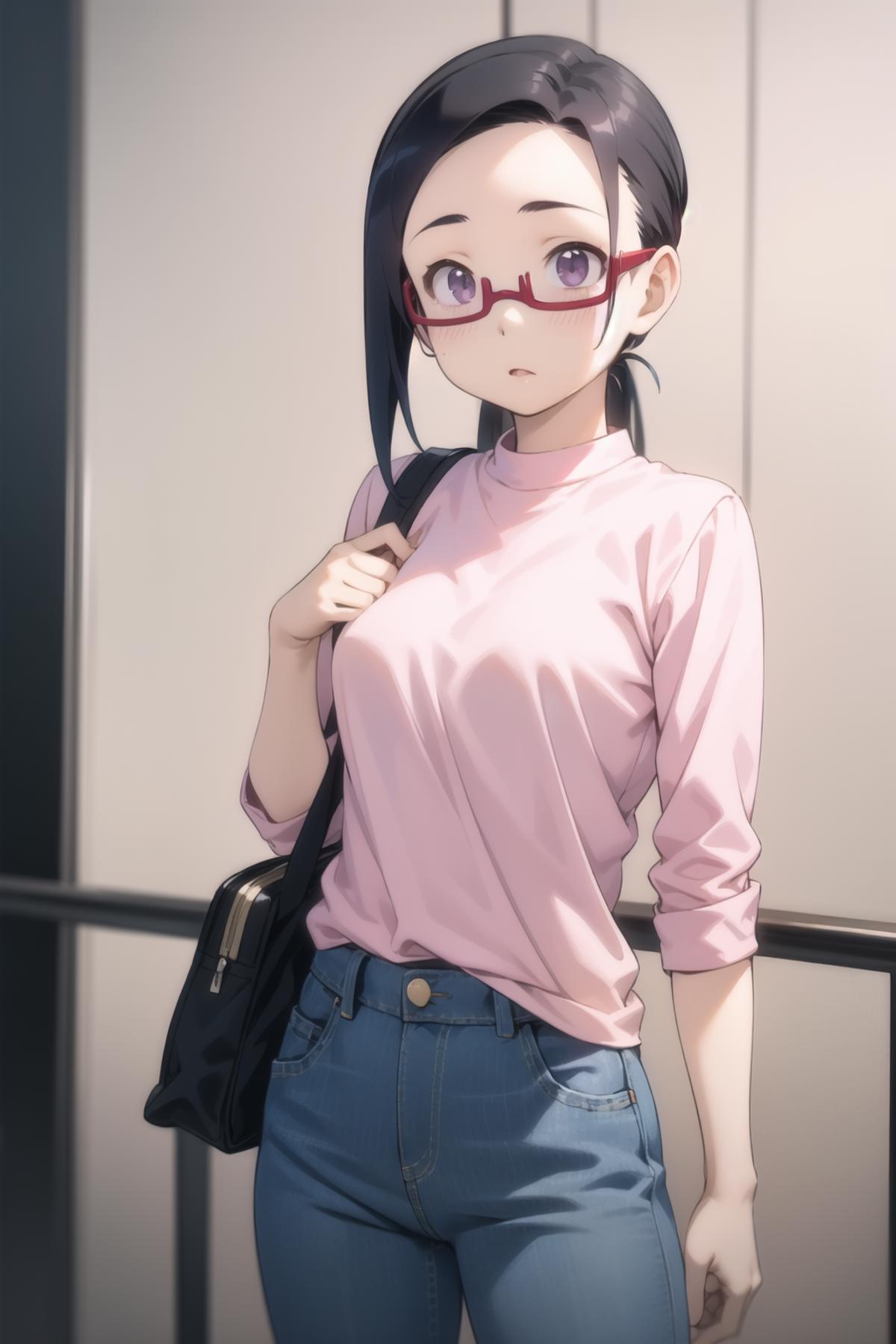 sato, glasses, red-framed eyewear, under-rim eyewear, blue tank top, track pants, red pants