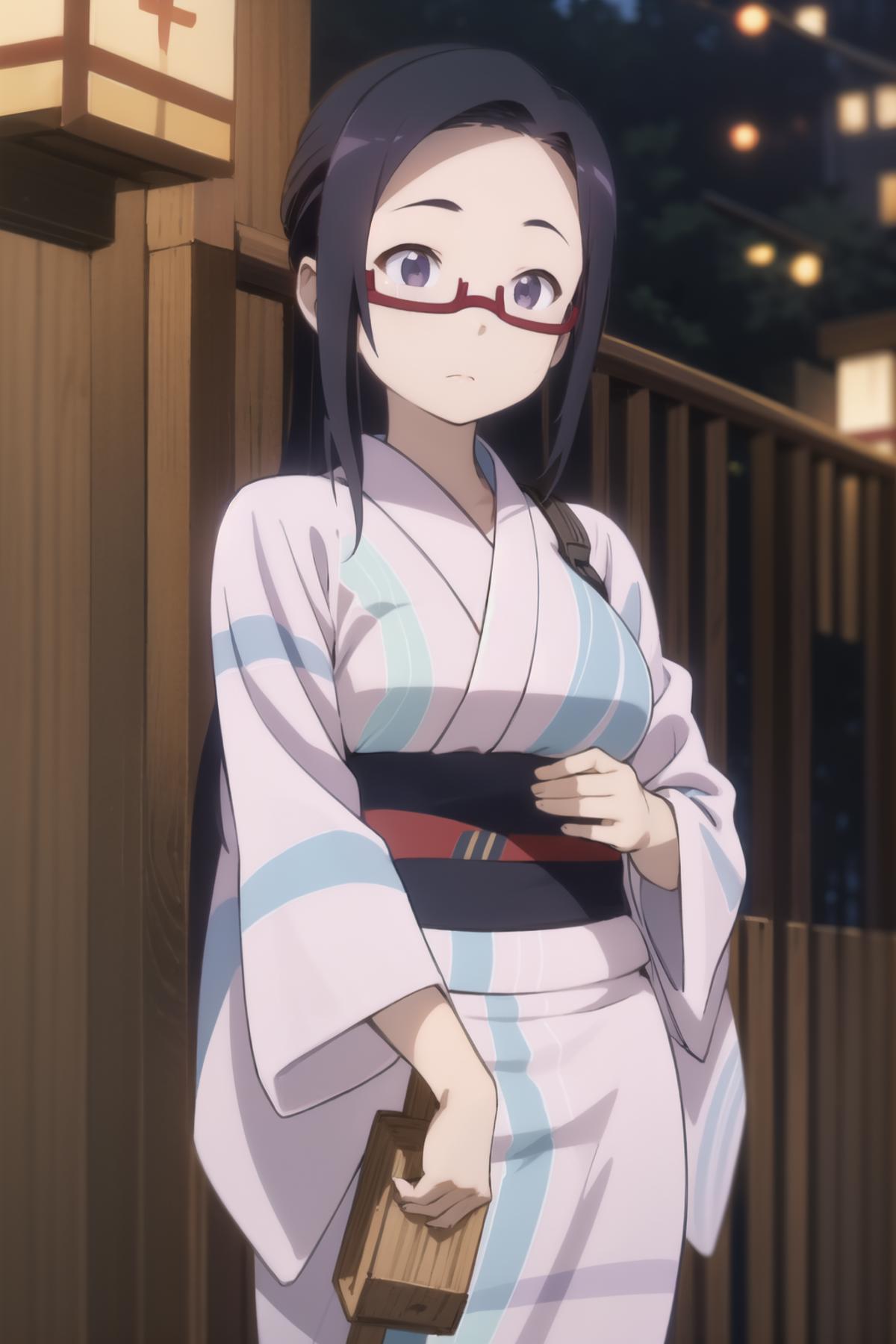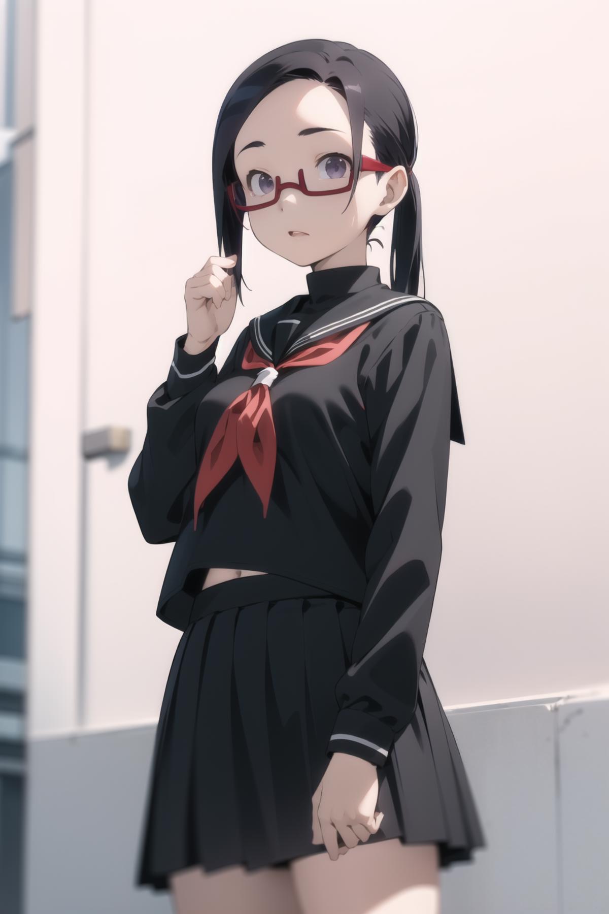 sato, glasses, red-framed eyewear, under-rim eyewear