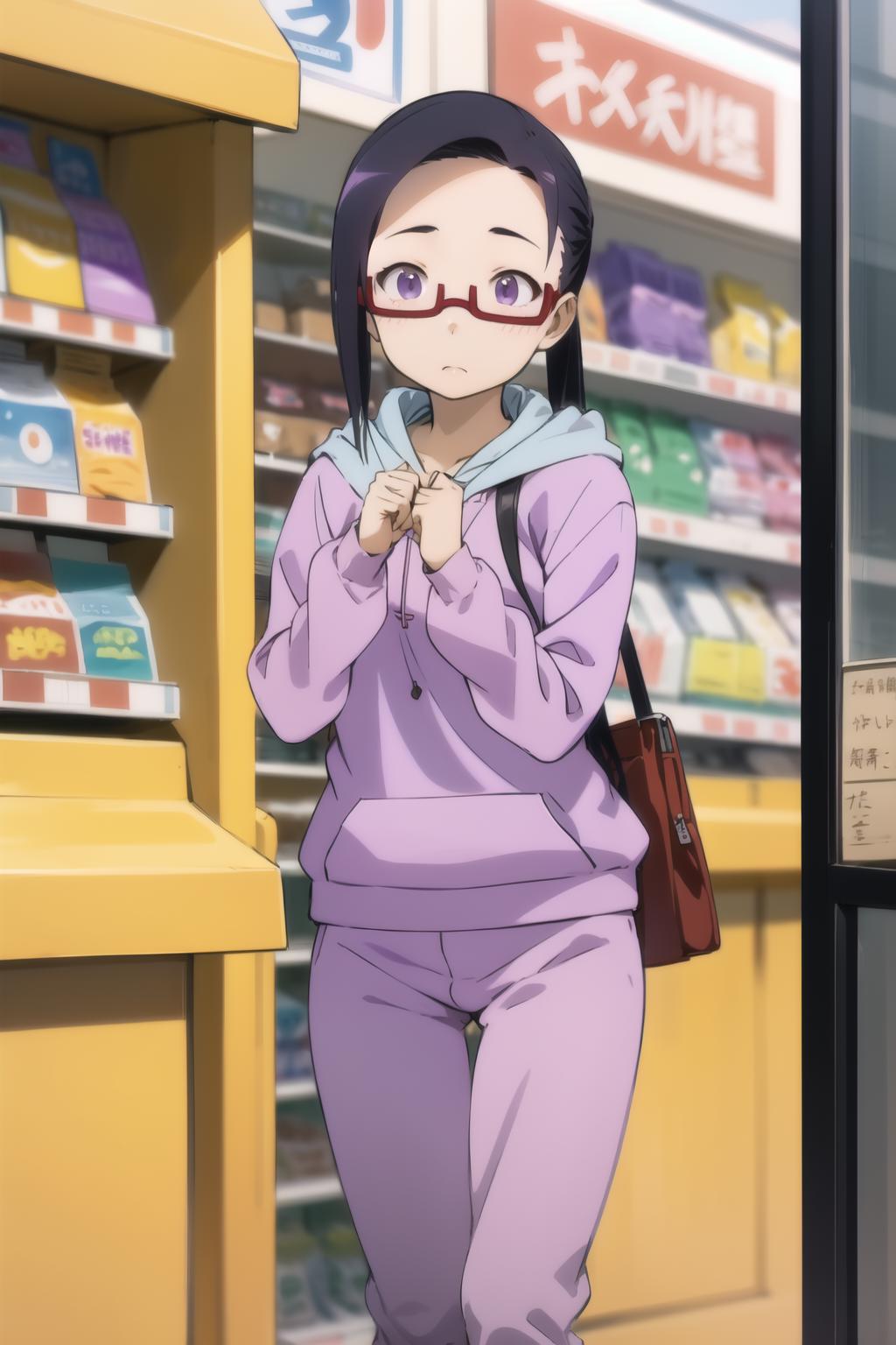 sato, glasses, red-framed eyewear, under-rim eyewear, blue hoodie, track jacket, track pants
