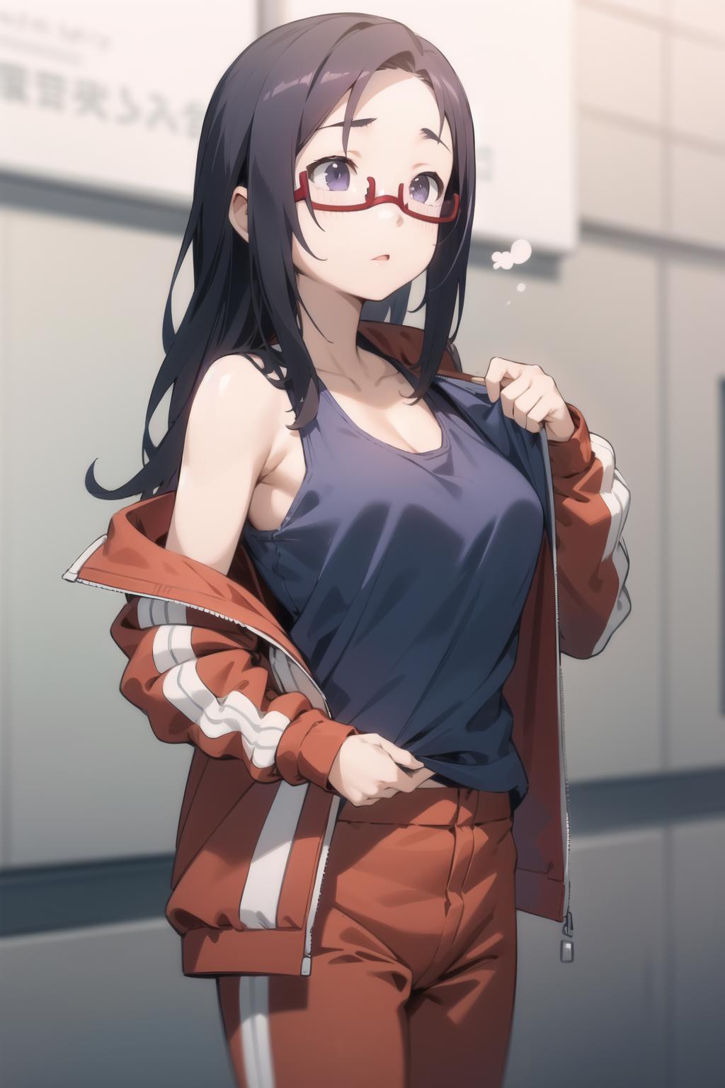 sato, glasses, red-framed eyewear, under-rim eyewear, blue tank top, track jacket, , track pants