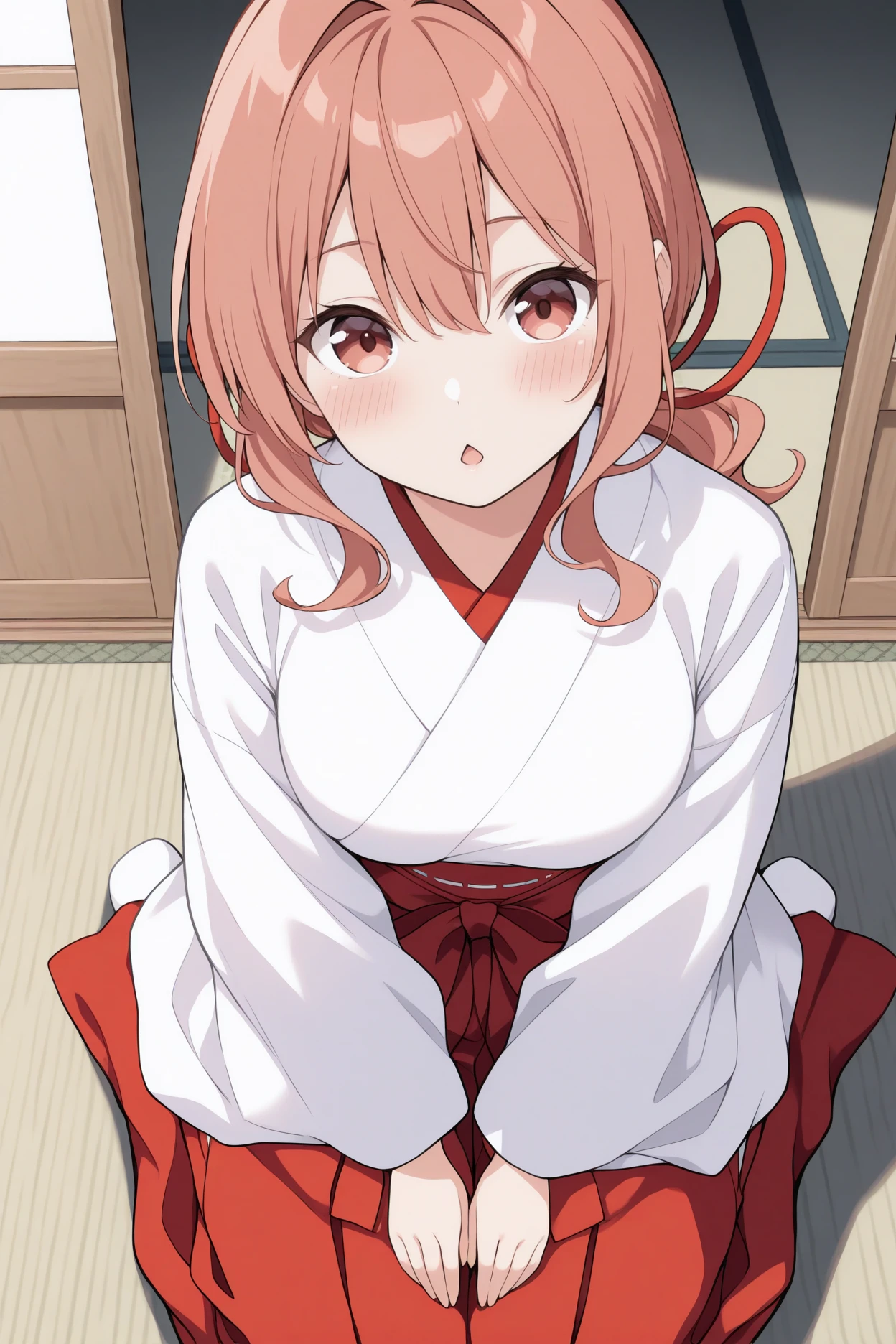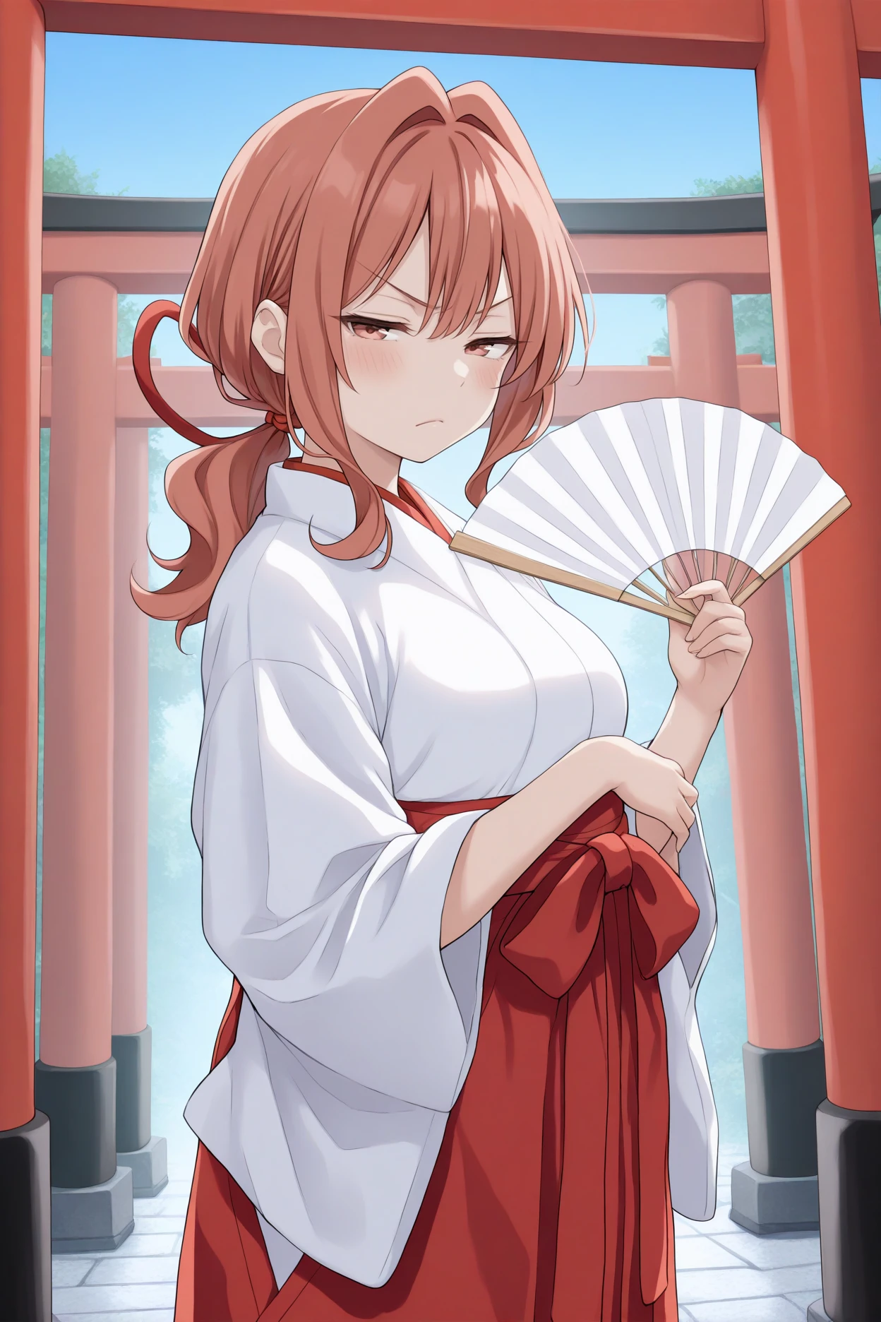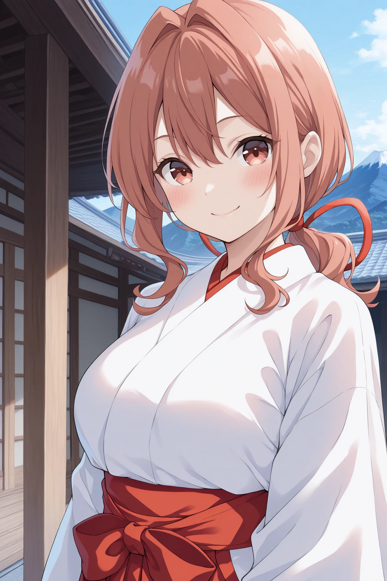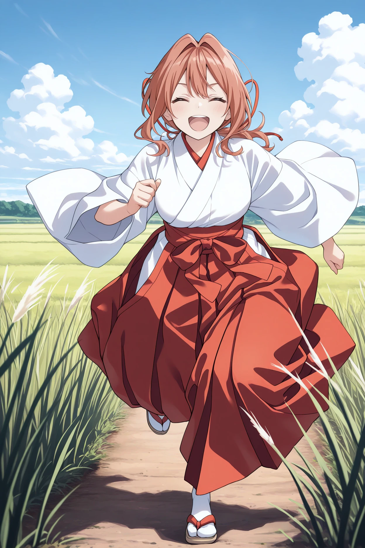 Add "white kimono, red hakama skirt, wide sleeves" for her typical look.