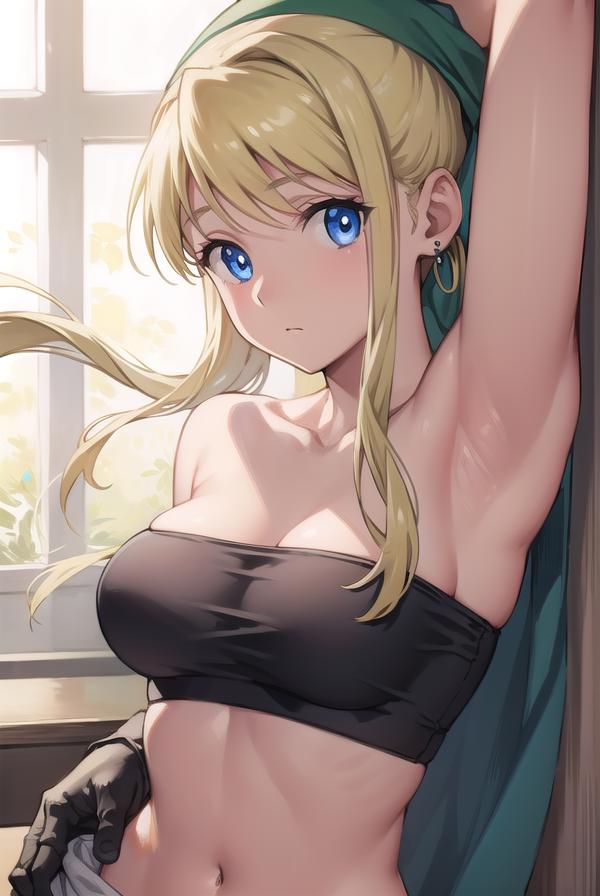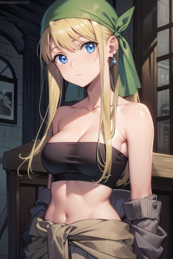 gloves, navel, cleavage, ???? shoulders, collarbone, earrings, midriff, pants, stomach, ???? arms, strapless, bandana, bandeau, tube top, grey gloves,