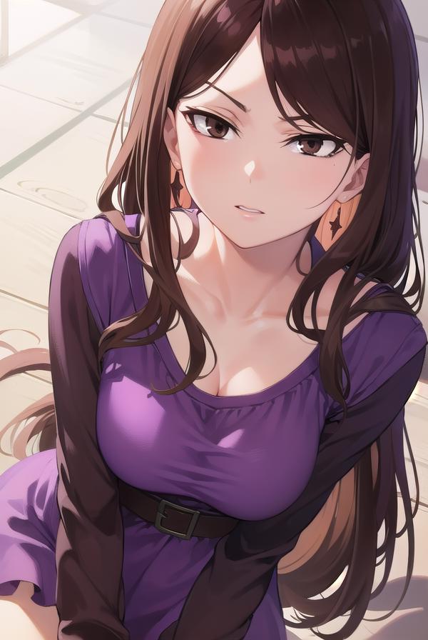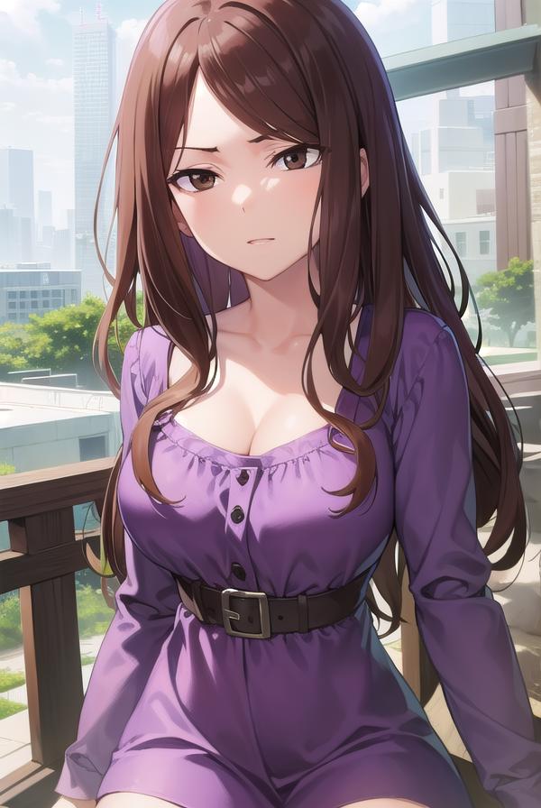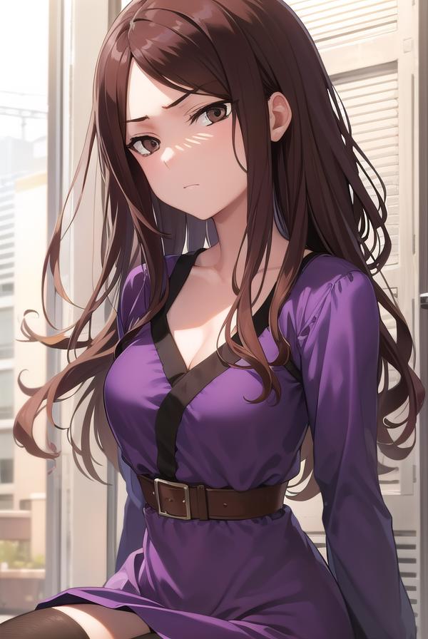 mugino shizuri, (brown eyes:1.7), brown hair, long hair, (swept bangs:1.5),