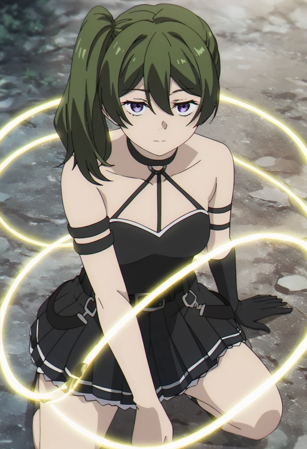 halterneck, black choker, armlet, arm strap, ???? shoulders, black gloves, single glove, black dress, sleeveless dress, pleated dress, black belt, calflet, thigh strap, black footwear