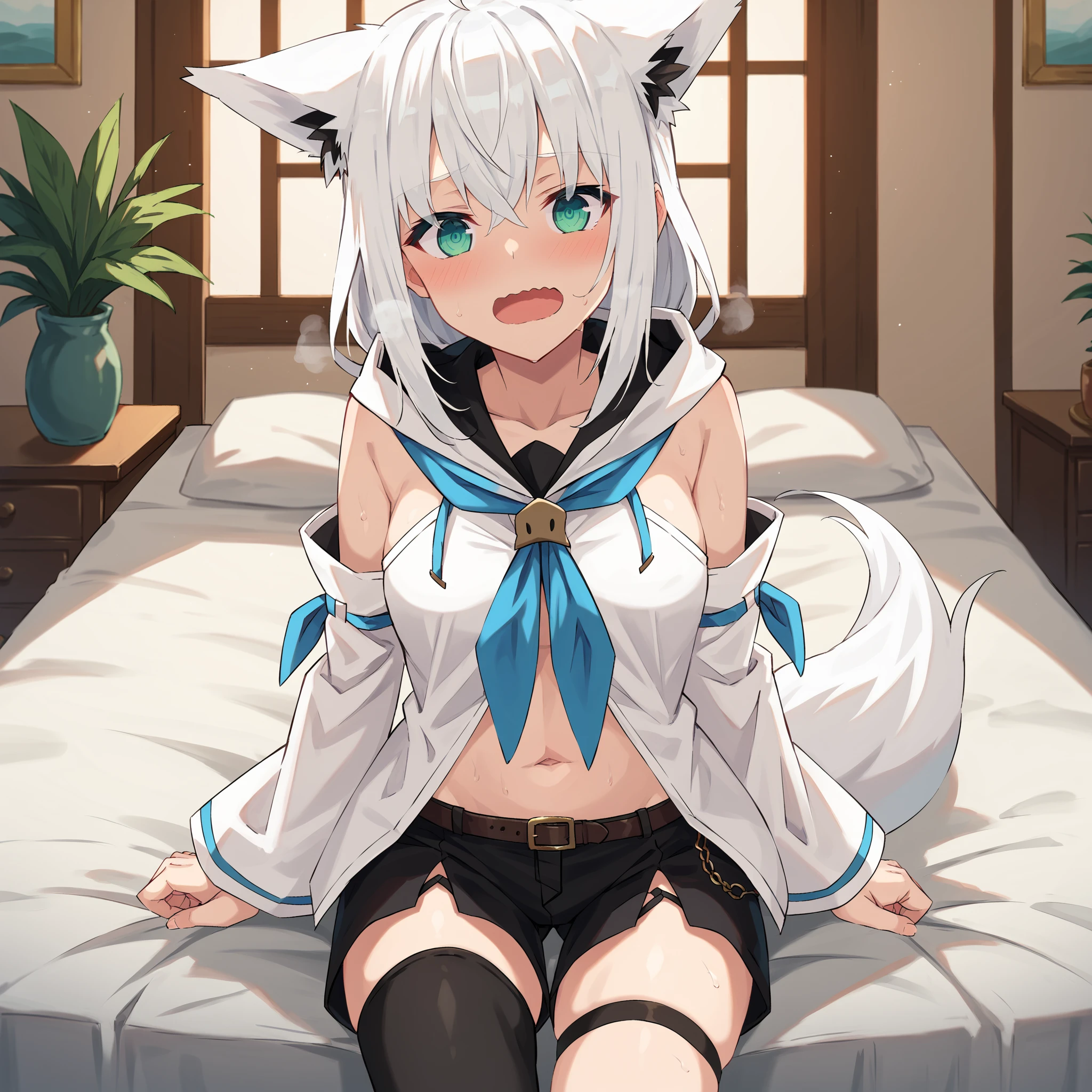 Shirakami_Fubuki, white hair, long hair, ahoge, animal ears, green eyes, breasts, fox tail