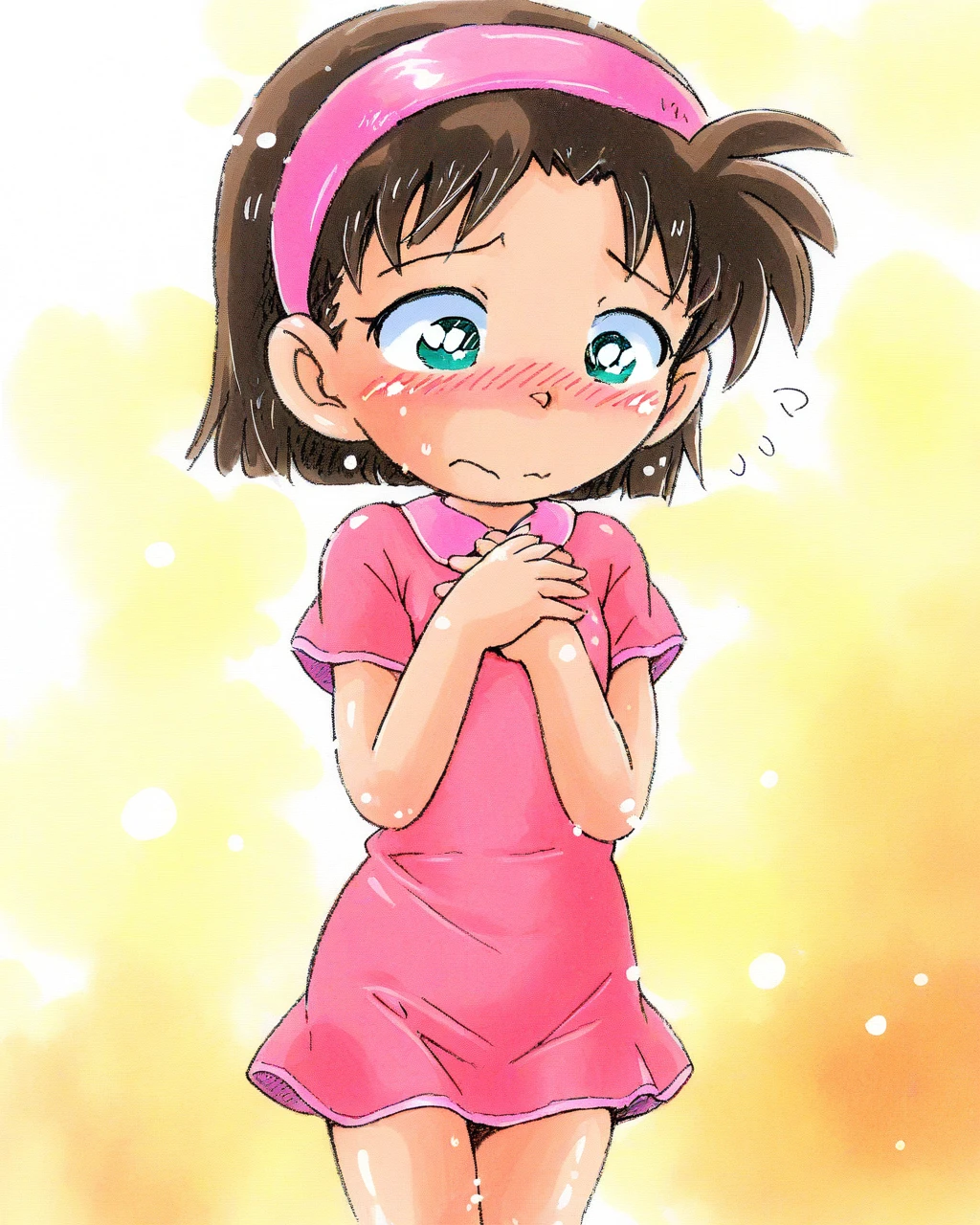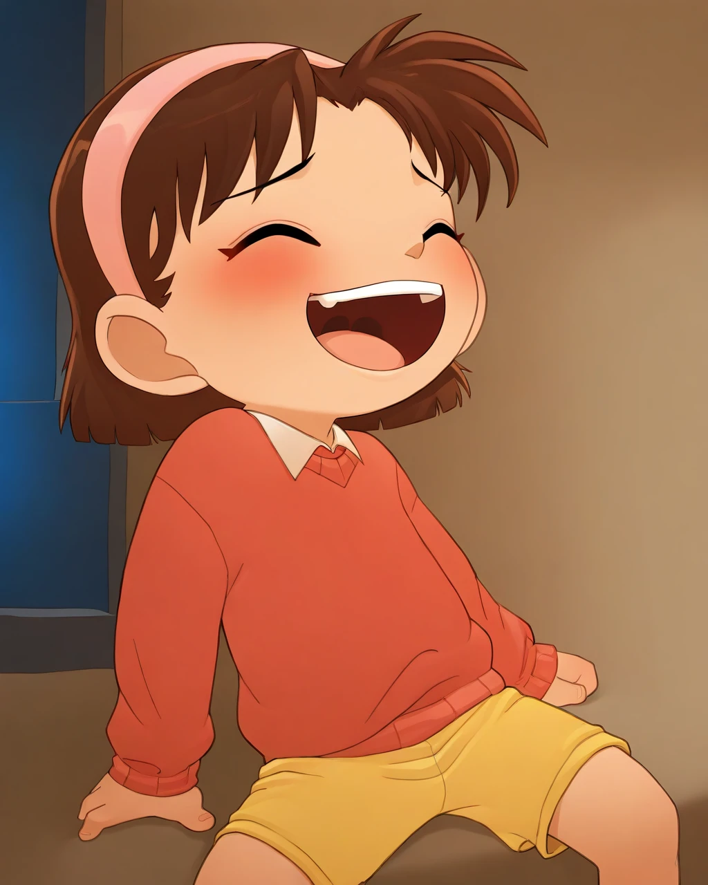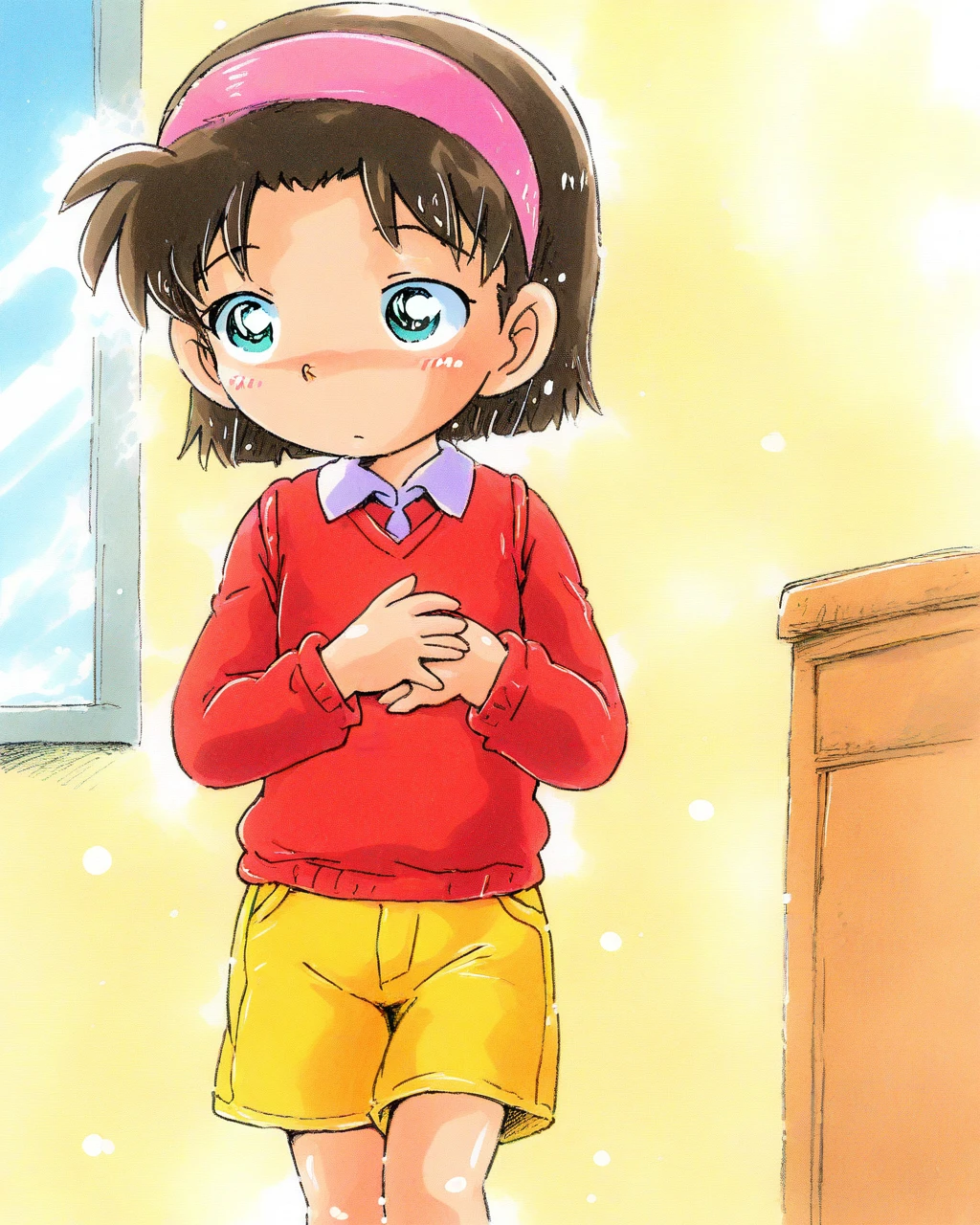 Use ayumiyoshida, child to summon her (the latter tag to guide AI creating her as a child), use blue eyes, hairband, bangs, short hair, brown hair to form her head, goes creative and add clothing tag to give her clothing, she has no default clothing.