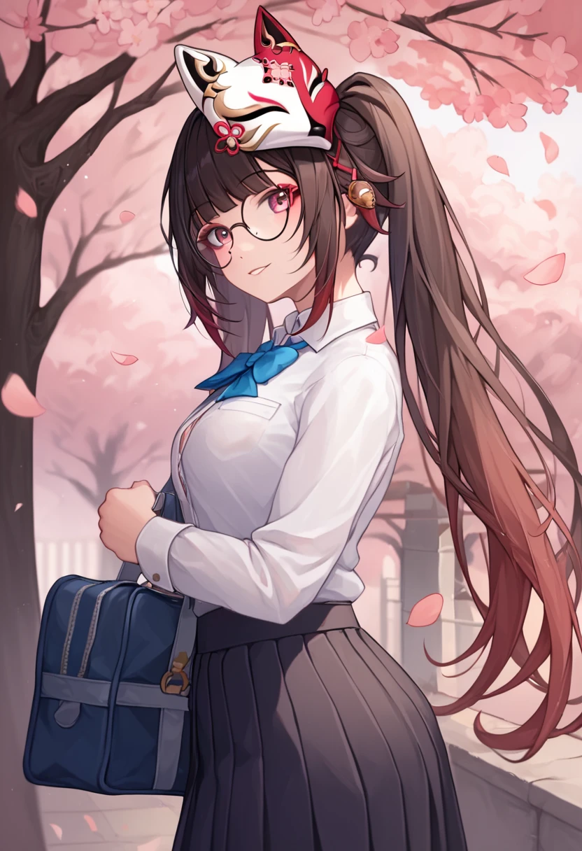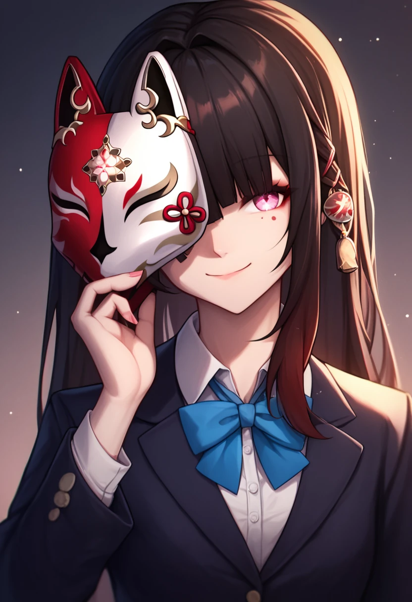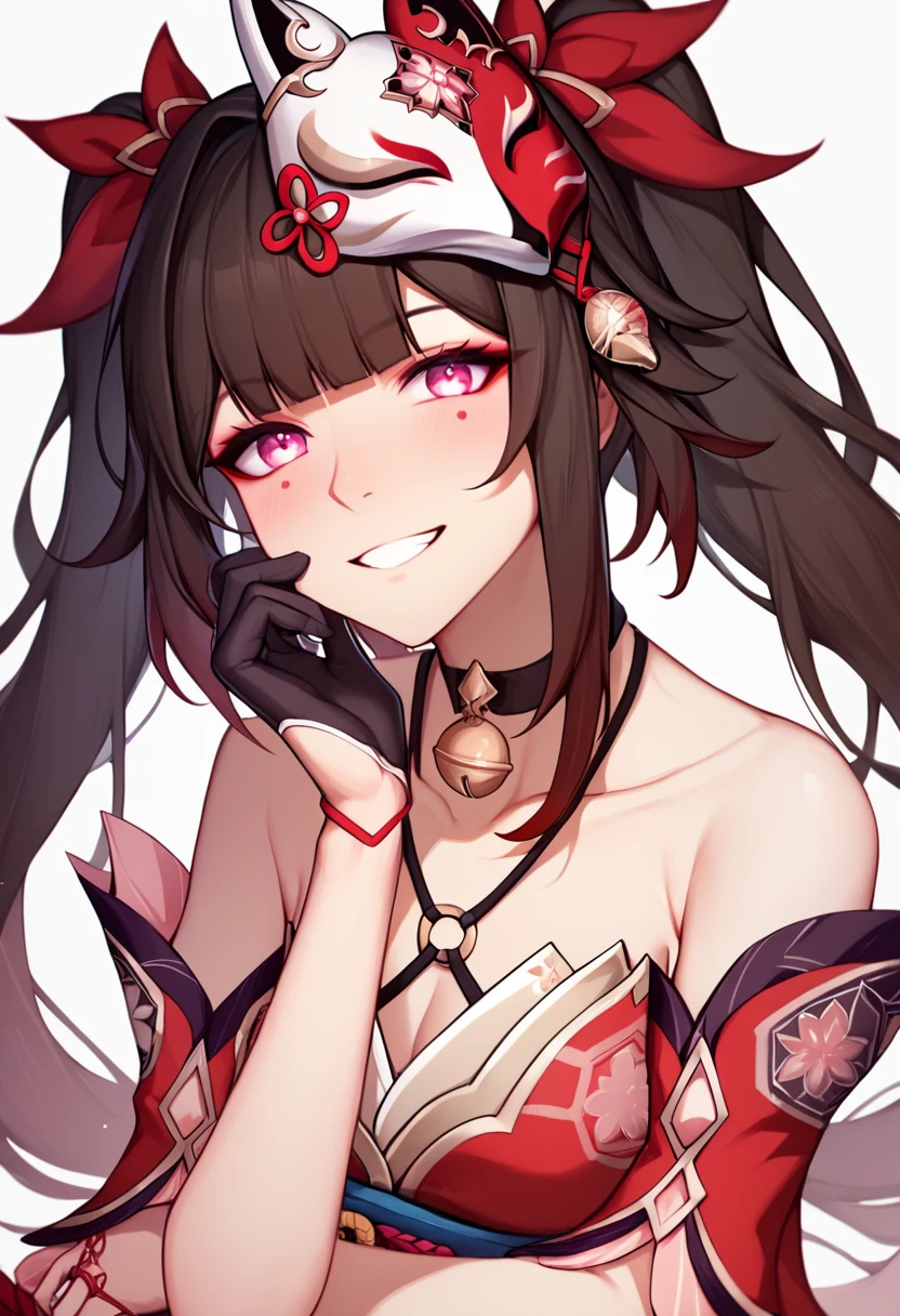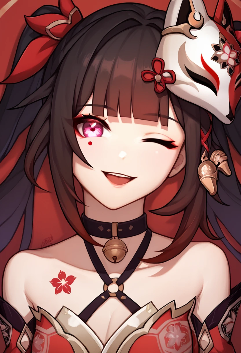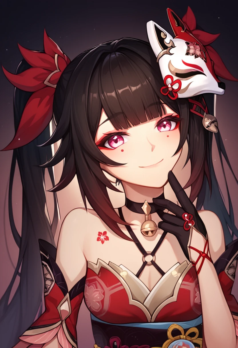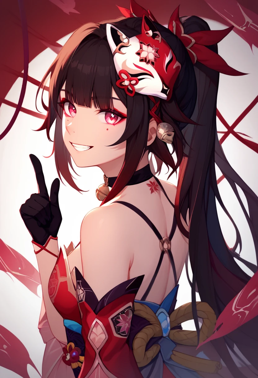 sparkle_\(honkai:_star_rail\), fox_mask, bare_shoulders, red_dress, mask_on_head, neck_bell, black_choker, absurdres, criss-cross_halter, black_gloves2,school_uniform