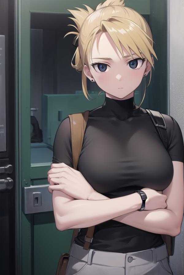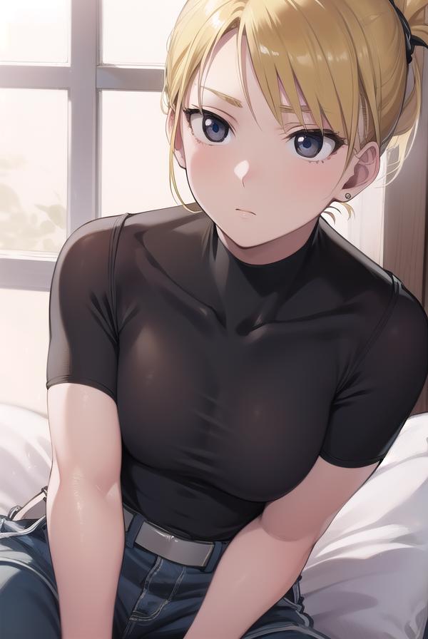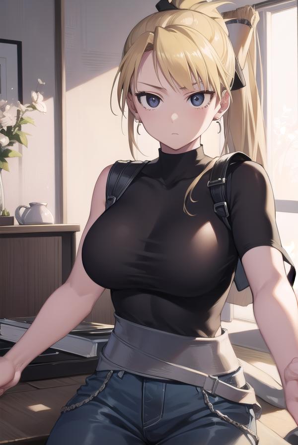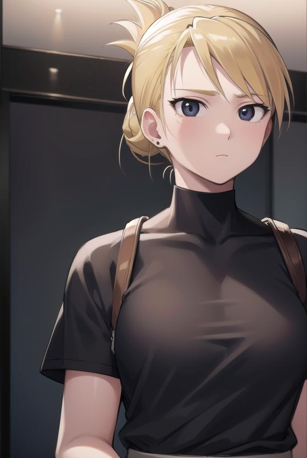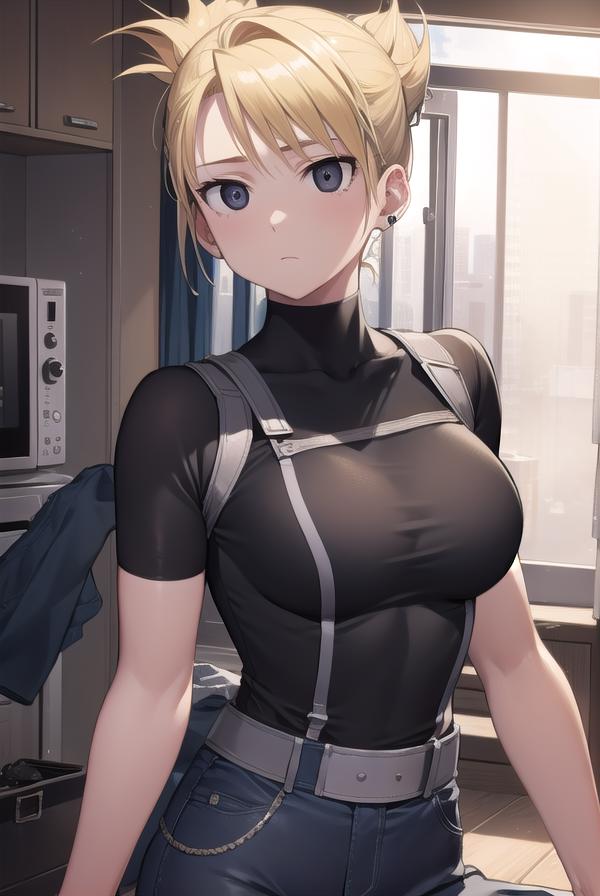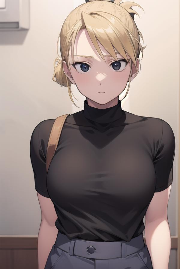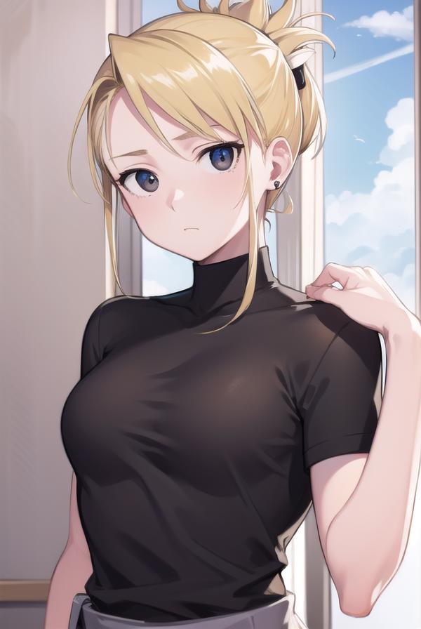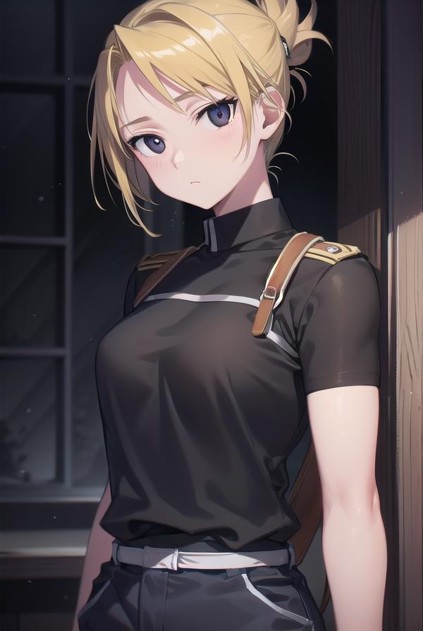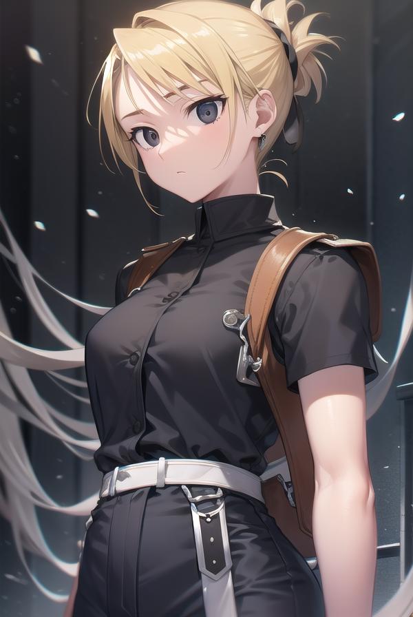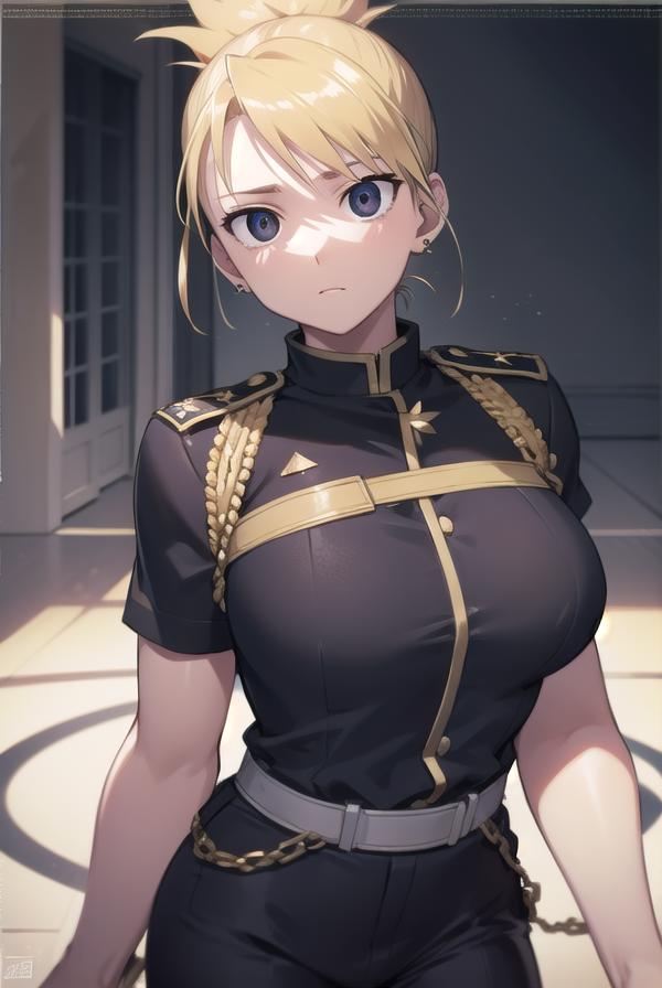 riza hawkeye, blonde hair, (black eyes:1.5), folded ponytail,