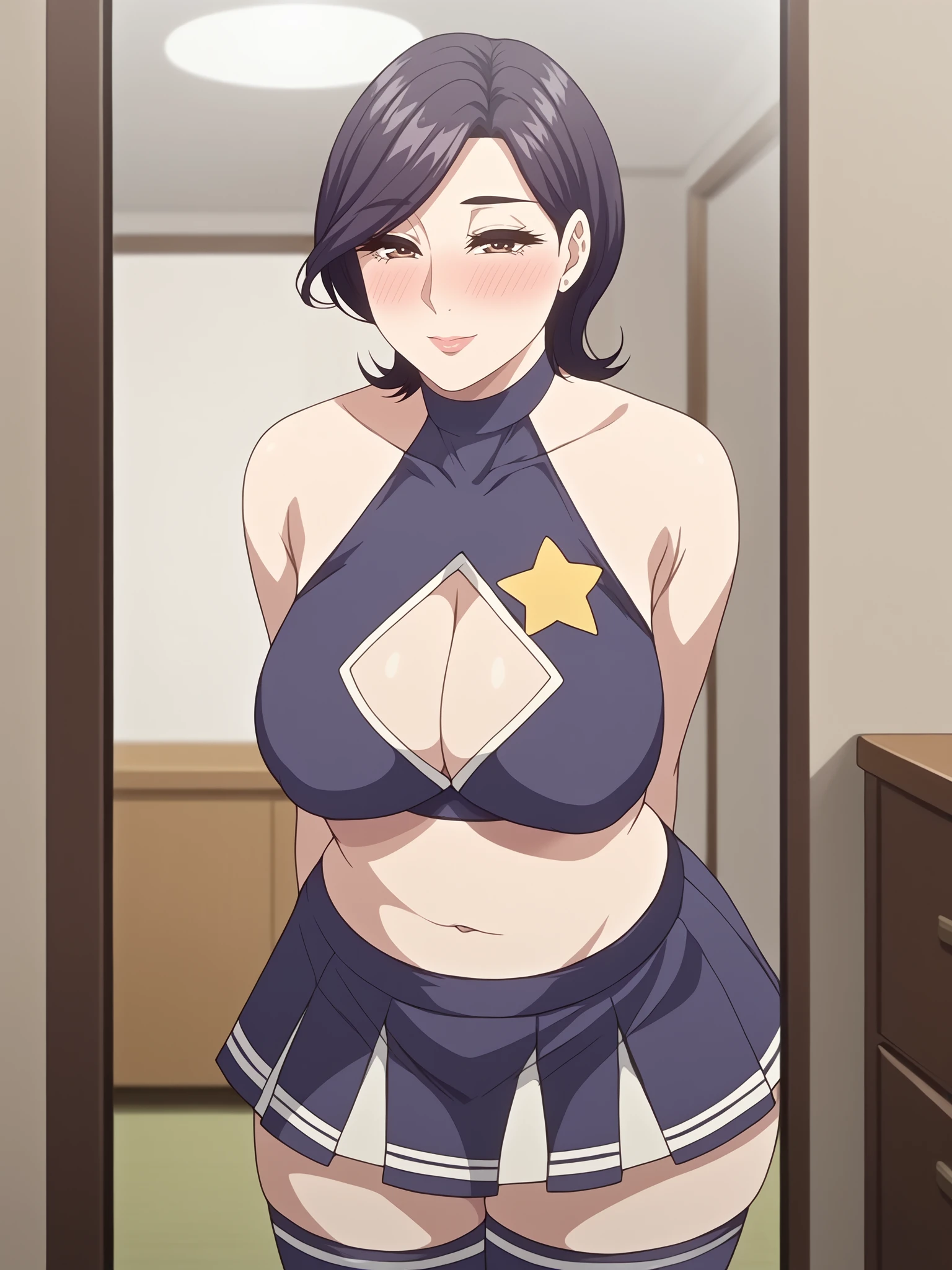 Minako, mature female, 1girl, milf, cleavage, short hair, black hair, purple hair, ????????????, puffy ???????, lipstick, big ???, earrings.