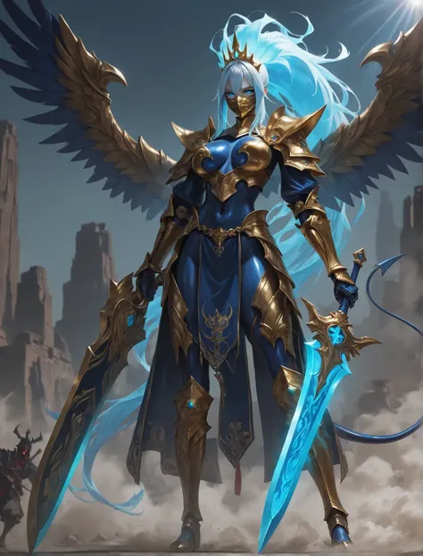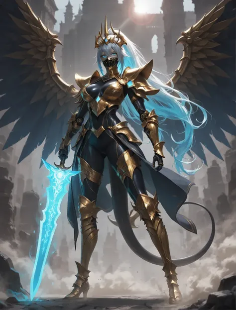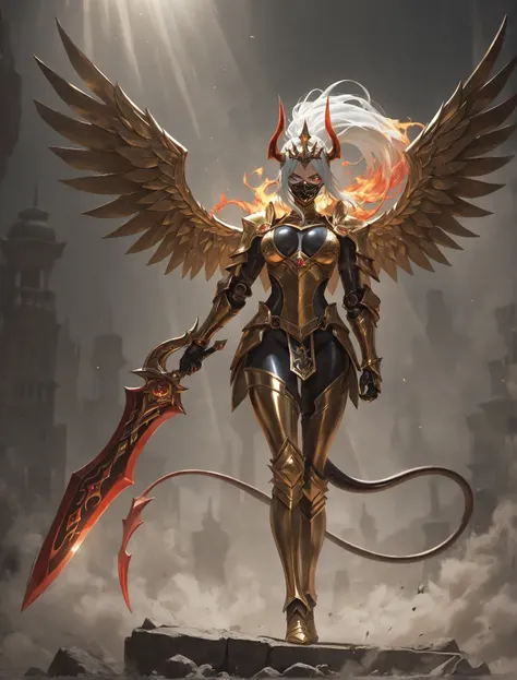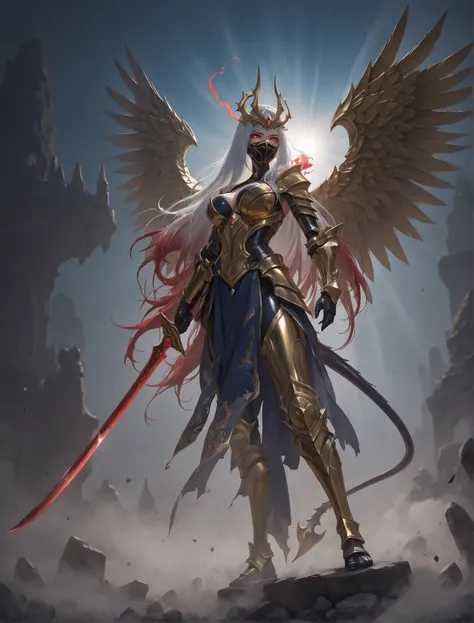 armure: Prougeominantly doré, complexe, avec une photographie, conception quelque peu angulaire. Accentuer les surfaces réfléchissantes et le revêtement distinct.arme: grand, doré, épée ornée avec une poignée unique et éventuellement un bord lumineux.Tête/affronter: Masked or partially obscurouge face, potentially with glowing eyes or complexe facial markings.cheveux: long, écoulement, orange ardent/rouge, ressemblant à des flammes ou à des plumes de phénix. Devrait avoir une qualité lumineuse.ailes: grand, doré, featherouge ailes, rappelant un ange ou un phénix, avec une force, présence imposante.tail: mince, Sombre (possibly black or very Sombre grey), avec une pointe en forme de flèche, suggérant un élément démoniaque ou draconique qui contraste avec les traits angéliques.atmosphère/Paramètre: rocheux, aride, or desolate landscapes avec une force sense of scale. Effets de sol brumeux ou brumeux. éclairage dramatique, possibly with a doré or warm hue.Style artistique: Un mélange de rendu réaliste avec un style très stylisé, esthétique presque fantastique ou mythique. Pensez à l'art conceptuel de la haute fantaisie.Diversité des poses: Inclure une variété de poses dynamiques et statiques pour assurer la polyvalence.Éclairage: fort, souvent un éclairage directionnel pour mettre en valeur le brillant de l'armure et les cheveux de feu/ailes. Contre-jour pour créer des silhouettes et un éclairage de contour.Workflow proposé pour la génération (utilisant le LoRA entraîné):Sélection du modèle de base: A high-quality anime-style or fantasy-art specific checkpoint model that handles complexe details well (e.g., Anything V5, contrefaire, modèles fantaisie personnalisés).
