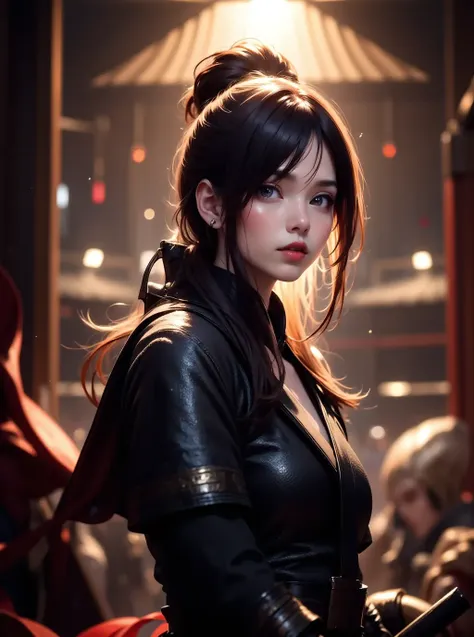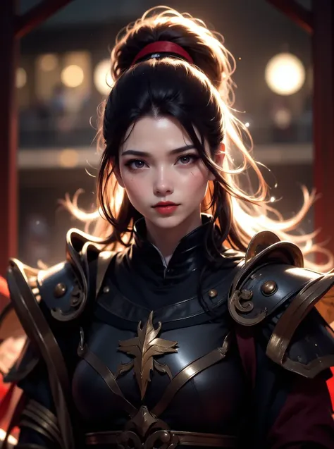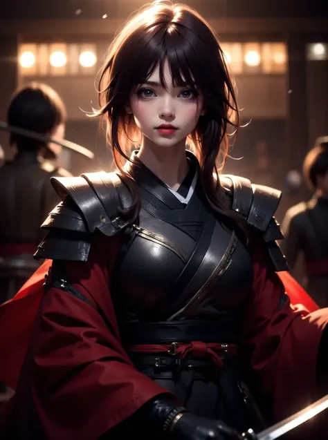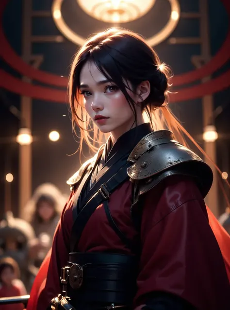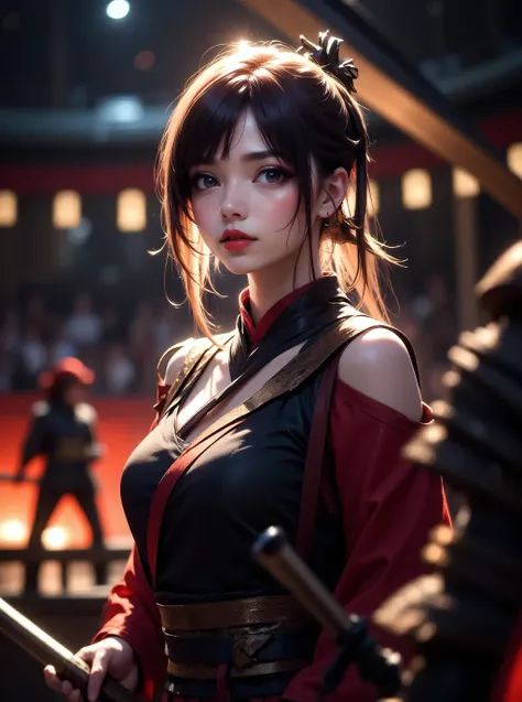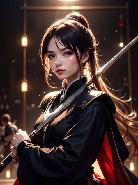 sujet: Débutante féminine de kendo, en particulier les personnages samouraïs ou similaires. Style artistique: Un style réaliste mais soigné, une esthétique presque numérique. détails: La conception spécifique de l'armure noire et dorée, le style de cheveux, et les traits fins du visage.