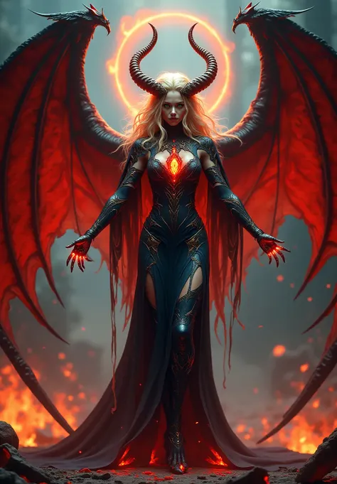 : Sorcière Divine de l'EnferUn concept de personnage mettant en scène une figure féminine époustouflante avec de longs, cheveux roux, Yeux bleus captivants, et des cornes de démon. Elle est parée d'une manière révélatrice, tenue noire en cuir avec des pièces d'armure dorées complexes sur ses épaules et un collier ras-de-cou. Le personnage est souvent représenté avec de grands, Ailes aux plumes sombres, combinant des esthétiques angéliques et démoniaques. Le style est très détaillé et inclut souvent des éléments de fantasy comme des armes magiques, effets lumineux, et un sombre, fond d'écran maussade. Parfait pour créer des portraits de fantasy avec un thème puissant et séduisant.