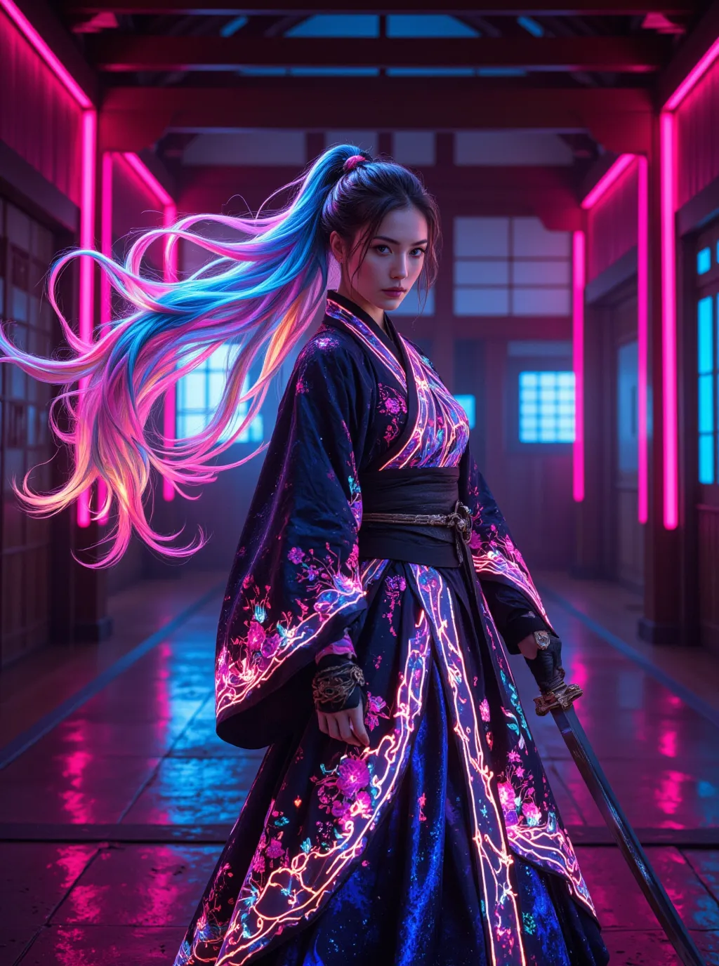 This is designed to generate images of a freathtakingly beautiful and ethereal character, incarnant l'essence d'un arc-en-ciel. Les caractéristiques du personnage sont le kendo ou le style de samouraï à deux épées (kenjetsu), créant un effet vraiment magique. Ses yeux ont une douceur, mystérieux éclat, et son expression est celle d'une confiance sereine.