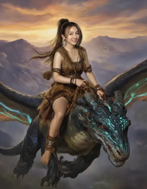 Un guerrier sans genre en fourrure et en cuir chevauche un dragon colossal et lumineux à travers le ciel du coucher de soleil au-dessus de montagnes majestueuses.