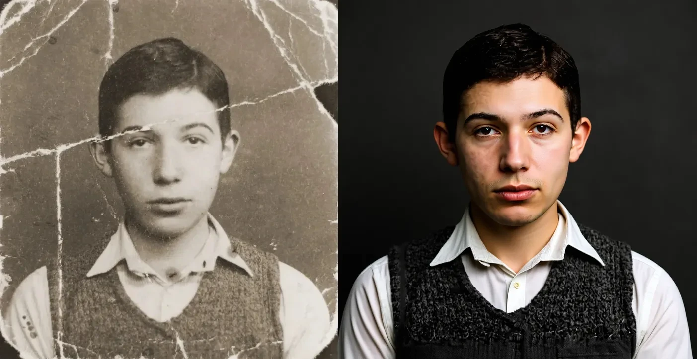 restaurer de vieilles photos, coloriser, reconstruire les parties manquantes, Réparer les dommages, supprimer le bruit, Régler la luminosité et le contraste, ajuster l'équilibre des couleurs, accentuer les traits du visage, restaurer les détails, agrandir à haute résolution."