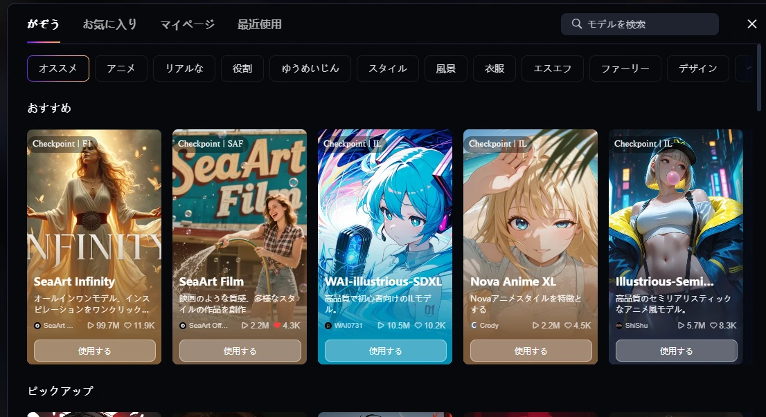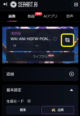 下記の黄色い枠の箇所をクリックすると、モデルのリストが表示され好きなモデルを選ぶことが出来ます。