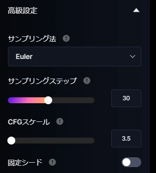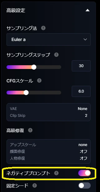以下はSeaArt Infinityの高級設定です。固定シードの上にあったネガティブプロンプトのスイッチが無くなっていますね。