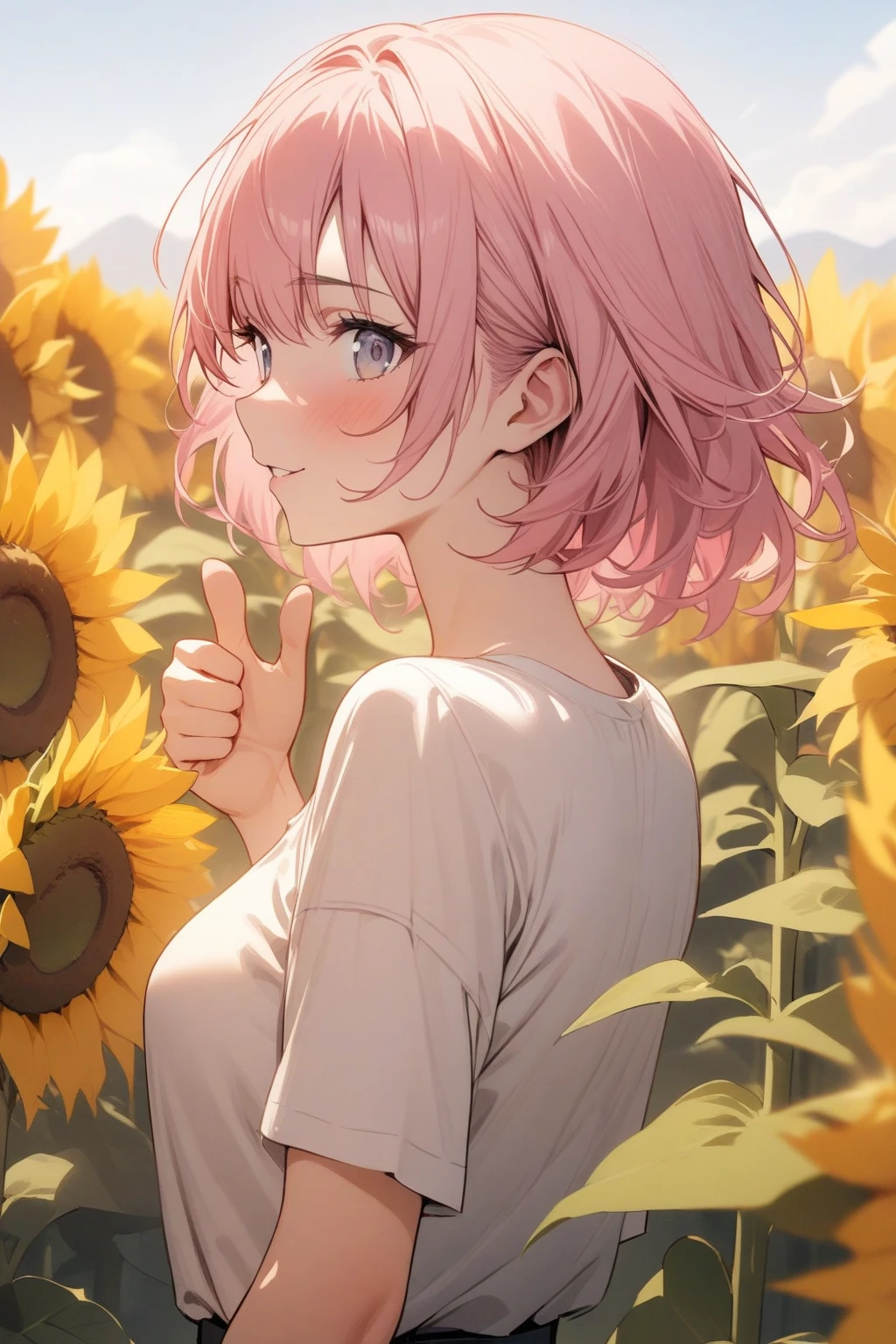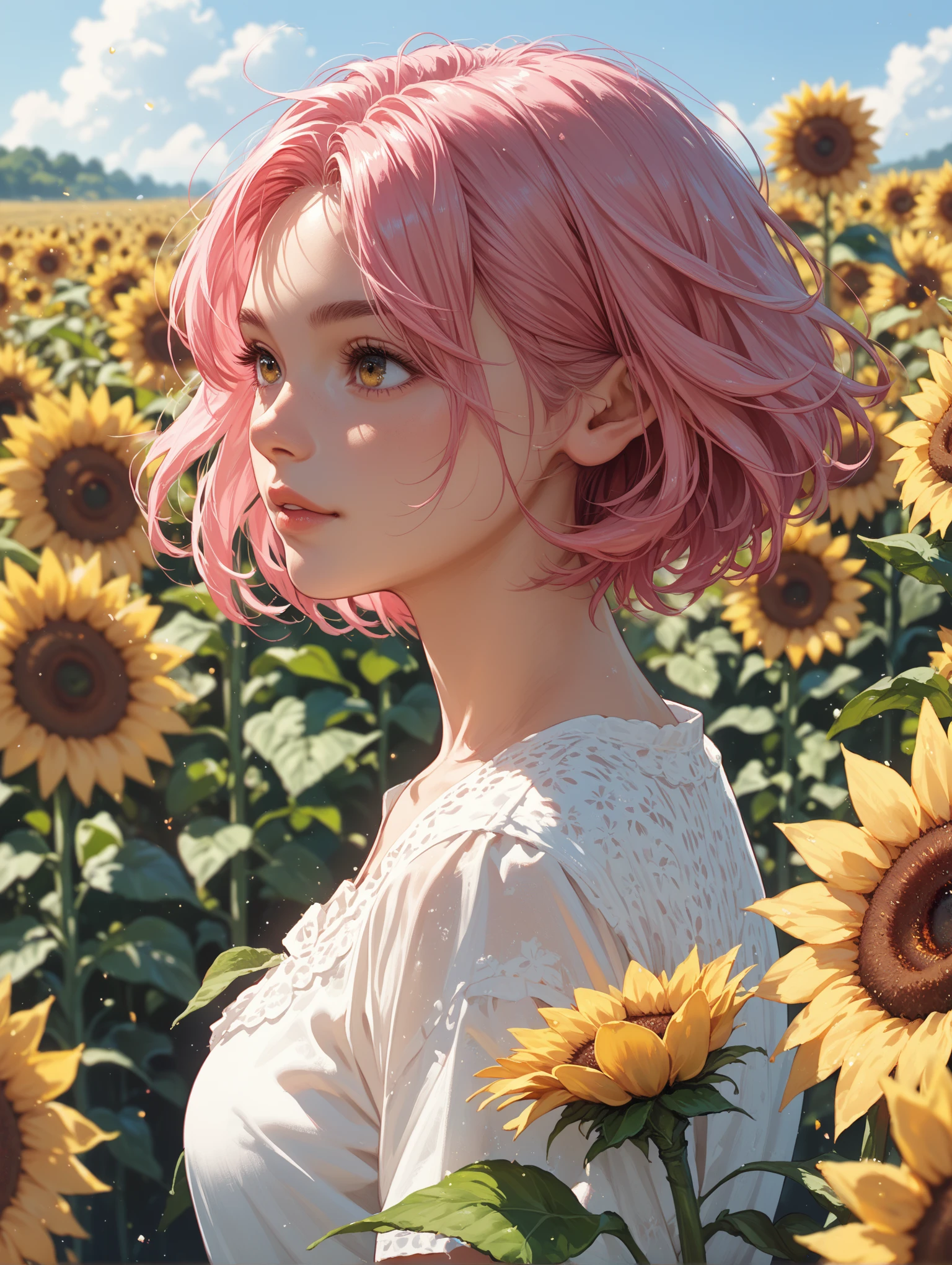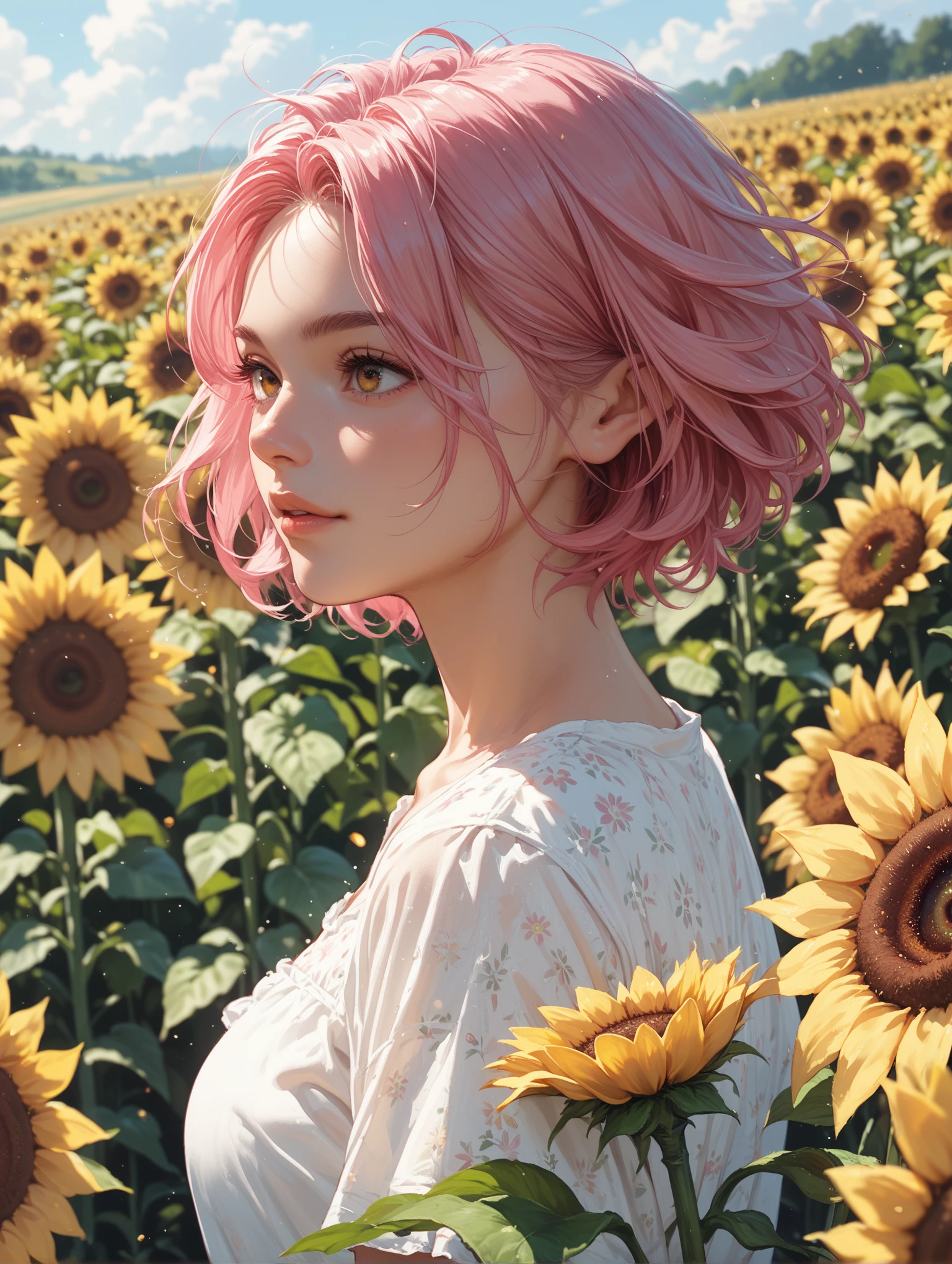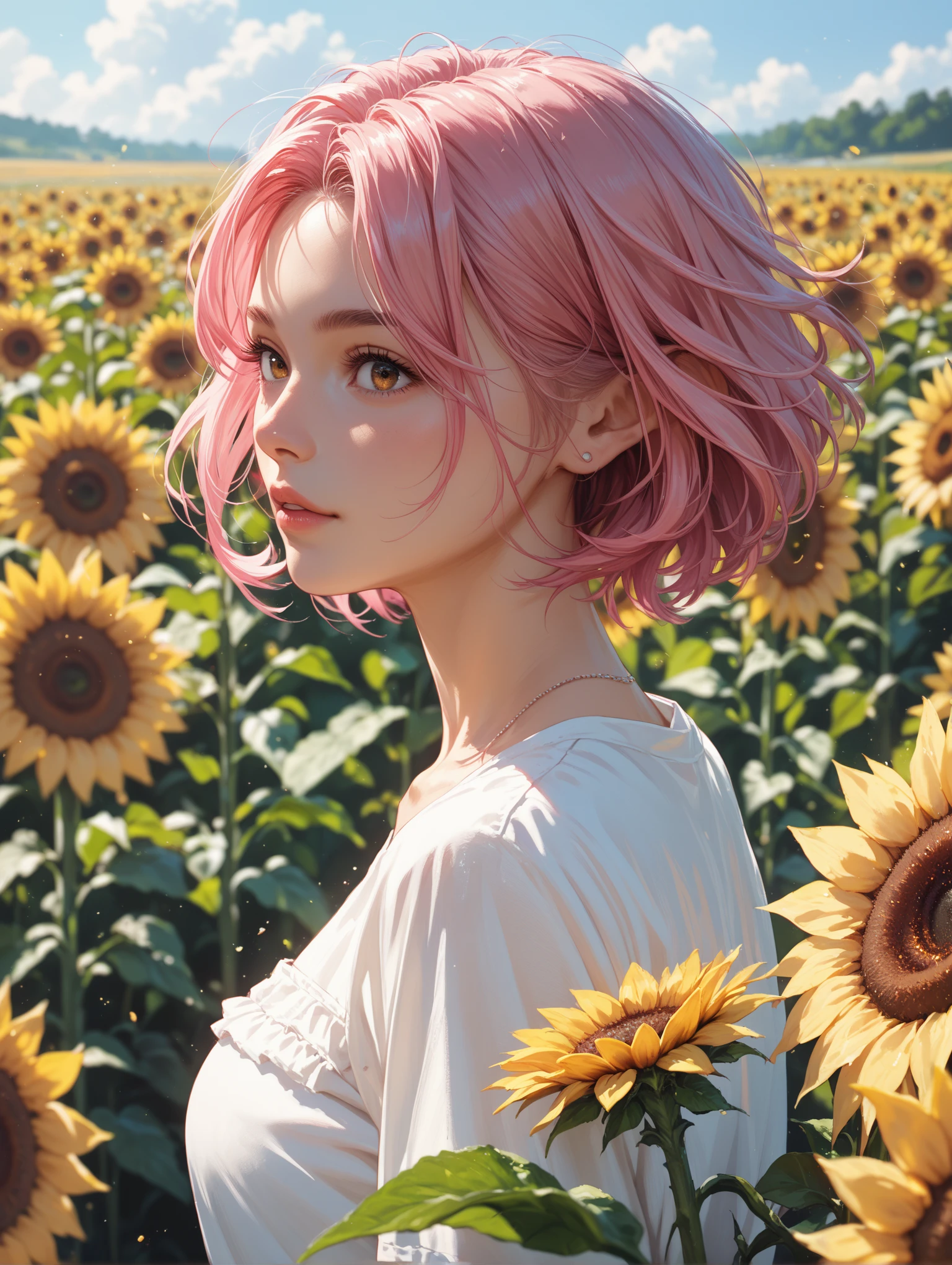 (masterpiece, best quality, high quality, ultra quality, extremely detailed, finely detailed, intricate details, sharp focus, perfect focus, high resolution, ultra high resolution, 4k, 8k, photo realistic, hyper realistic, beautiful lighting, dramatic lighting, perfect lighting, soft lighting, cinematic lighting, HDR, professional illustration, high-definition illustration, clean lines, vivid colors, rich texture, perfect ?, realistic skin texture), 1girl, ピンクの髪, ショートヘア, 上半身ショット, ひまわり畑