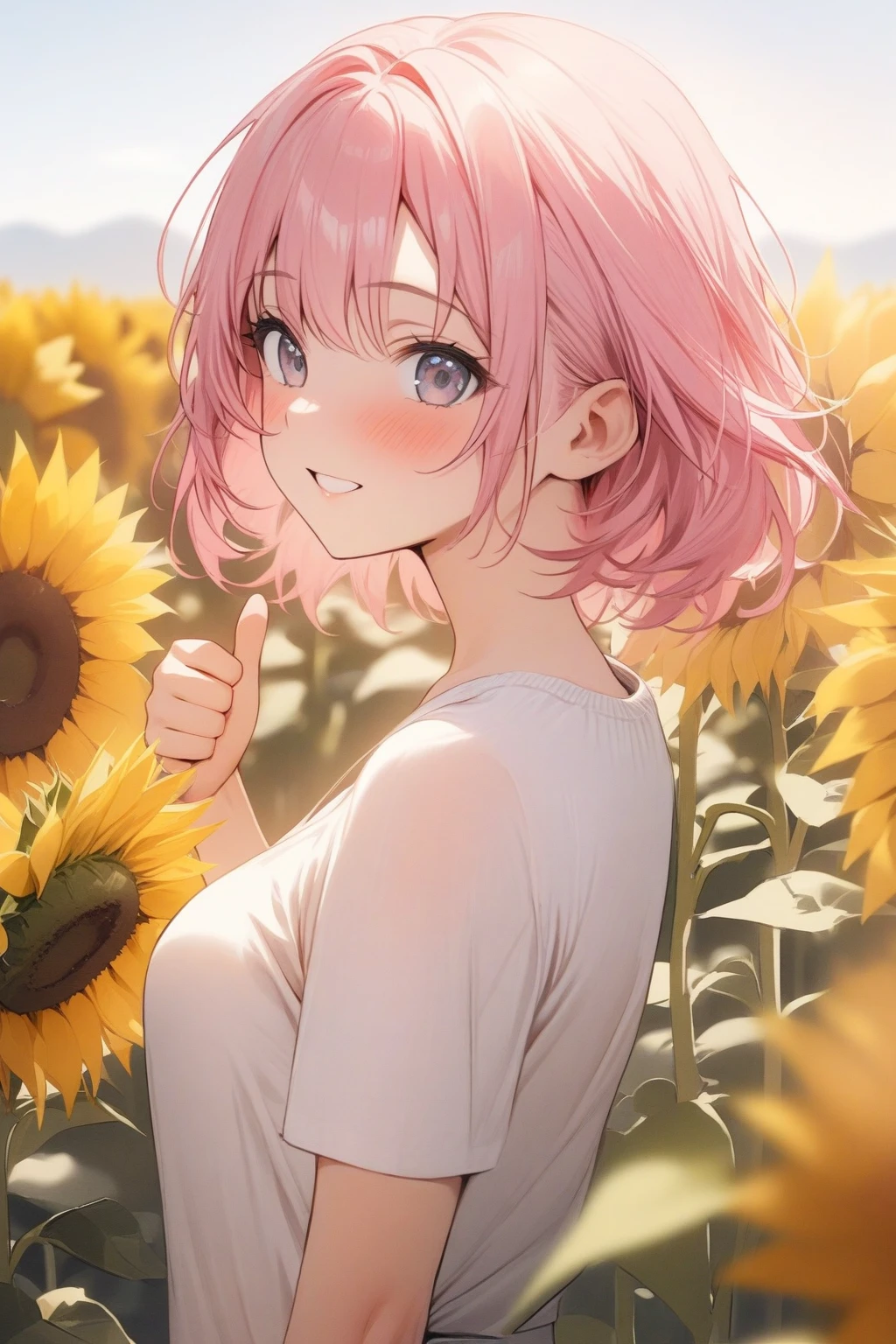 ポジティブプロンプト:masterpiece, best quality, high quality, 1girl, ピンクの髪, ショートヘア, サムズアップ, 上半身ショット, ひまわり畑