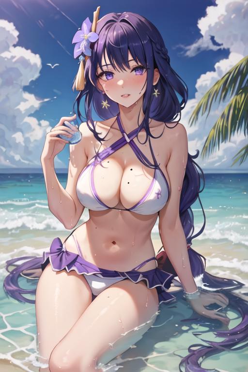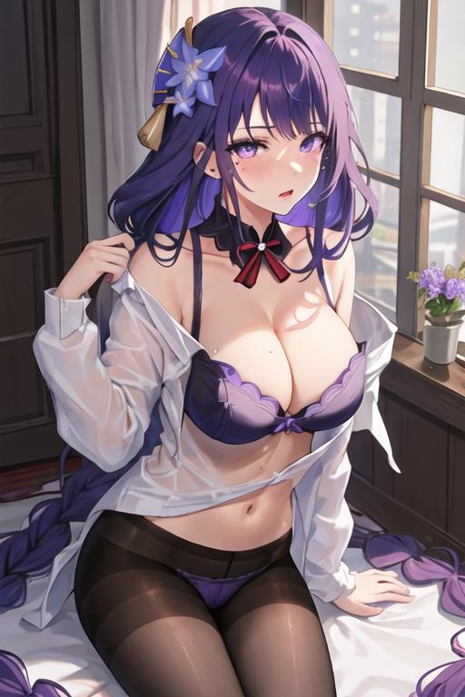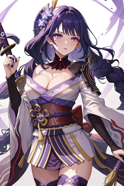 The trigger word is raiden_shogun_genshin, and the recommended tags are masterpiece, best quality, highres, solo, {raiden_shogun_genshin:1.10}, long_hair, purple_hair, purple_eyes, bangs, ???????, mole_under_eye, mole, large_breasts, hair_ornament, braid, very_long_hair, braided_ponytail, cleavage, flower, thighs, hair_flower.