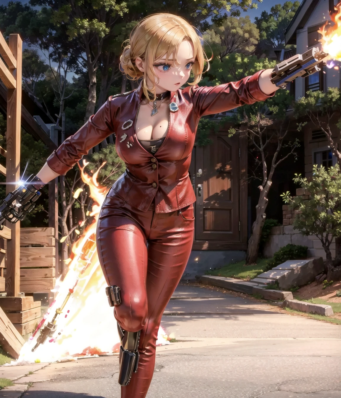 아마 t-x, terminator 3, blonde hair, single mechanical arm, comb over, forehead, parted bangs, slick side-parted bun 등의 프롬프트로(Trigger Word) T-X가 인간으로 위장한 기본 모습을 생성할 수 있겠습니다. 그리고, bullet hole, damaged, mechanical parts, robotic reveal 등을 추가하면 그 인간 모습에서 총탄의 피격으로 내부 구조가 일부 드러난 모습도 생성 가능합니다. 여기서 더 나아가 T-X의 옷을